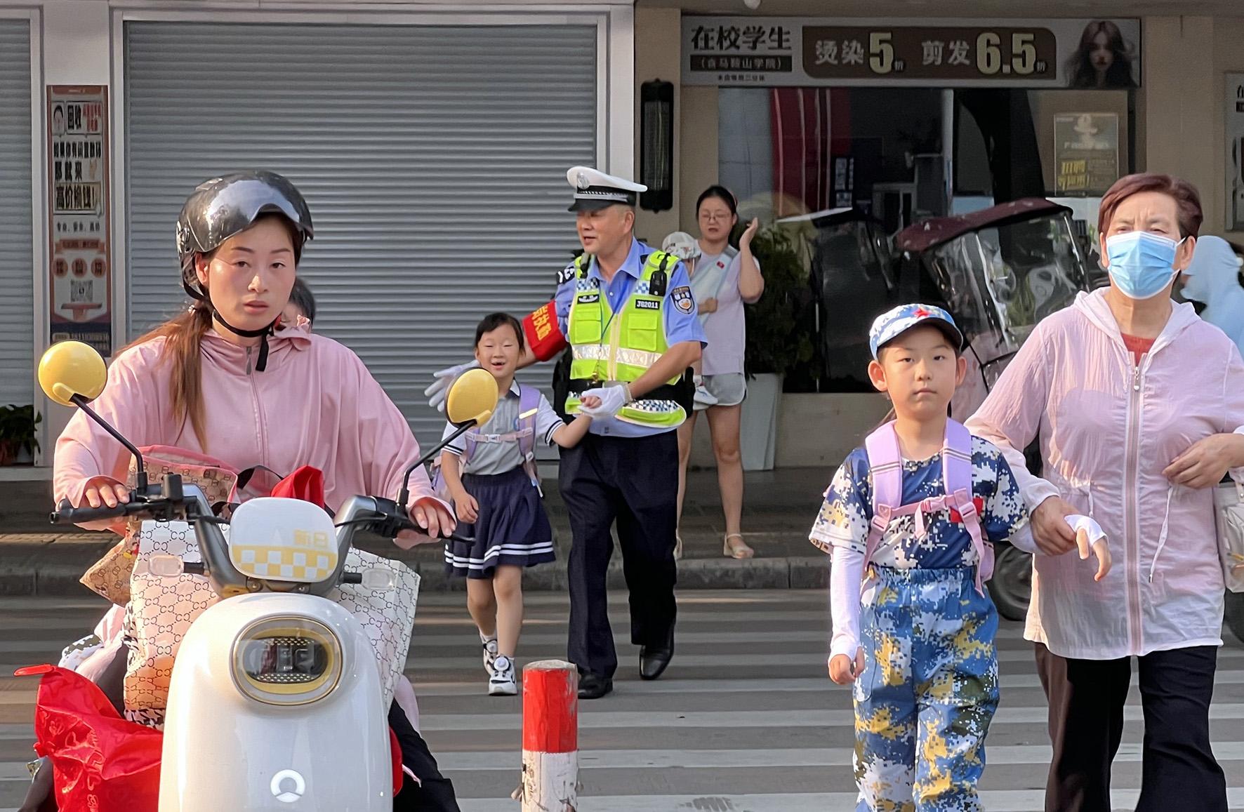 9月2日,安徽省當(dāng)涂縣公安局交管大隊(duì)民警正在校園周邊維護(hù)交通秩序,護(hù)送孩子們平安進(jìn)校園。
