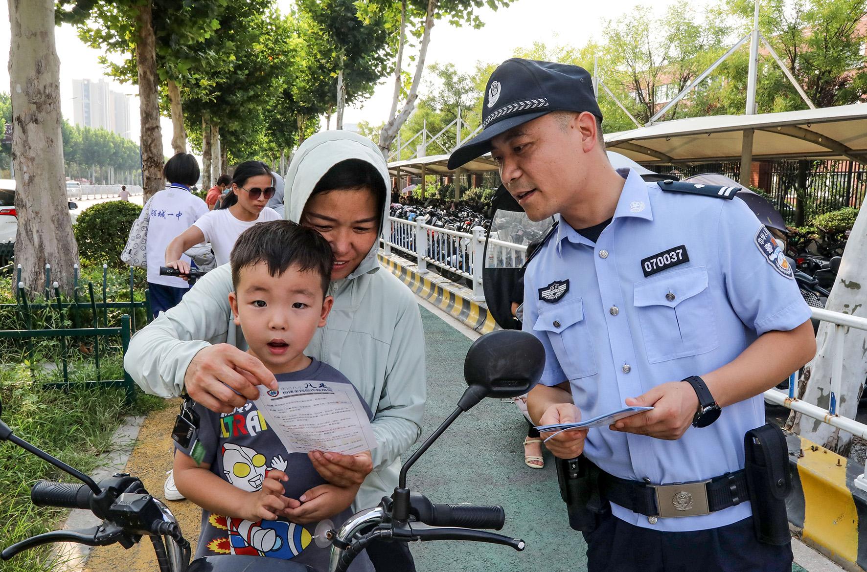 9月2日,山東省臨沂市郯城縣公安局民警向?qū)W生家長(zhǎng)發(fā)放反詐宣傳單。