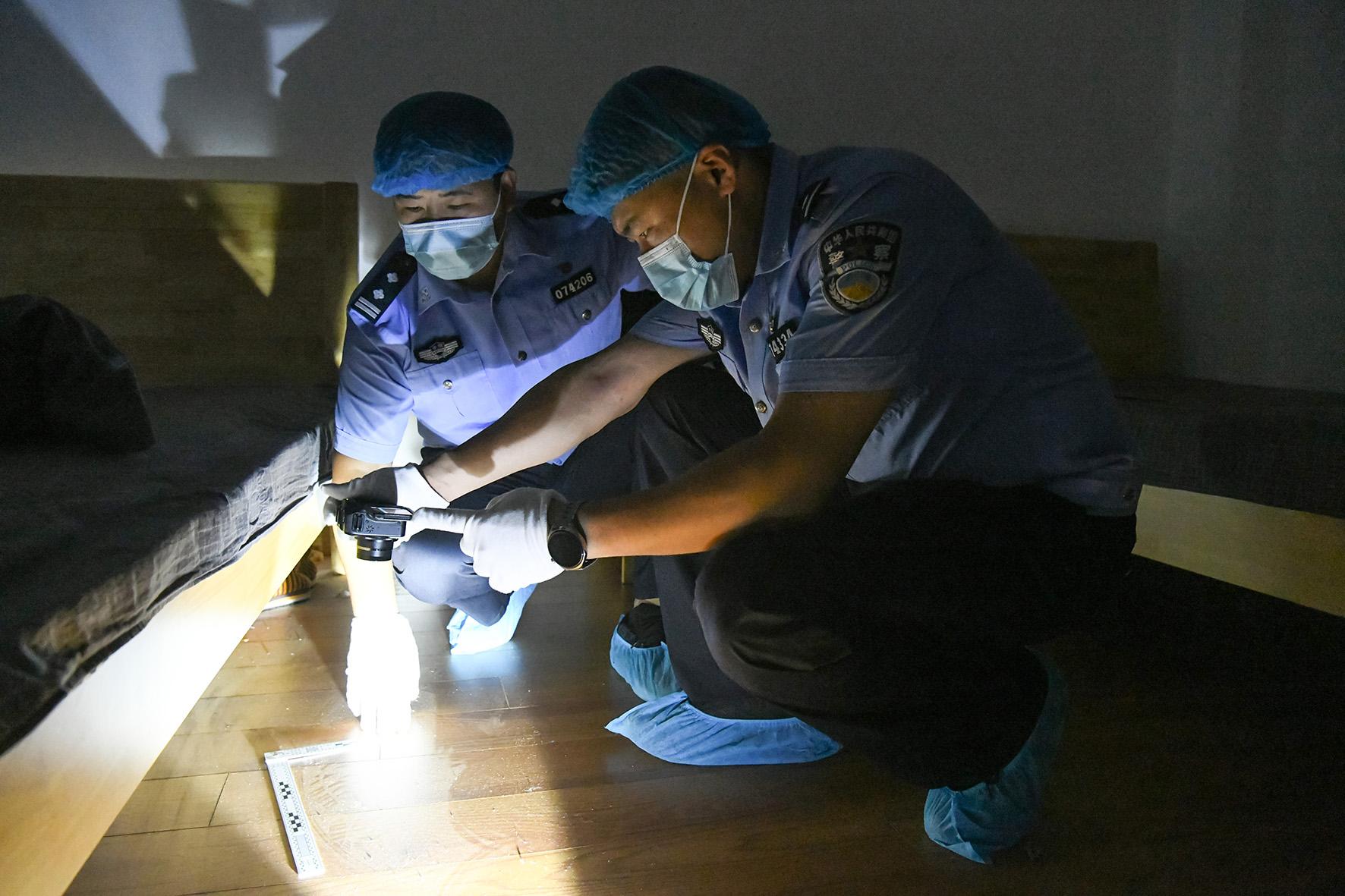 圖為刑事技術(shù)民警分析提取入室盜竊犯罪現(xiàn)場(chǎng)足跡。
