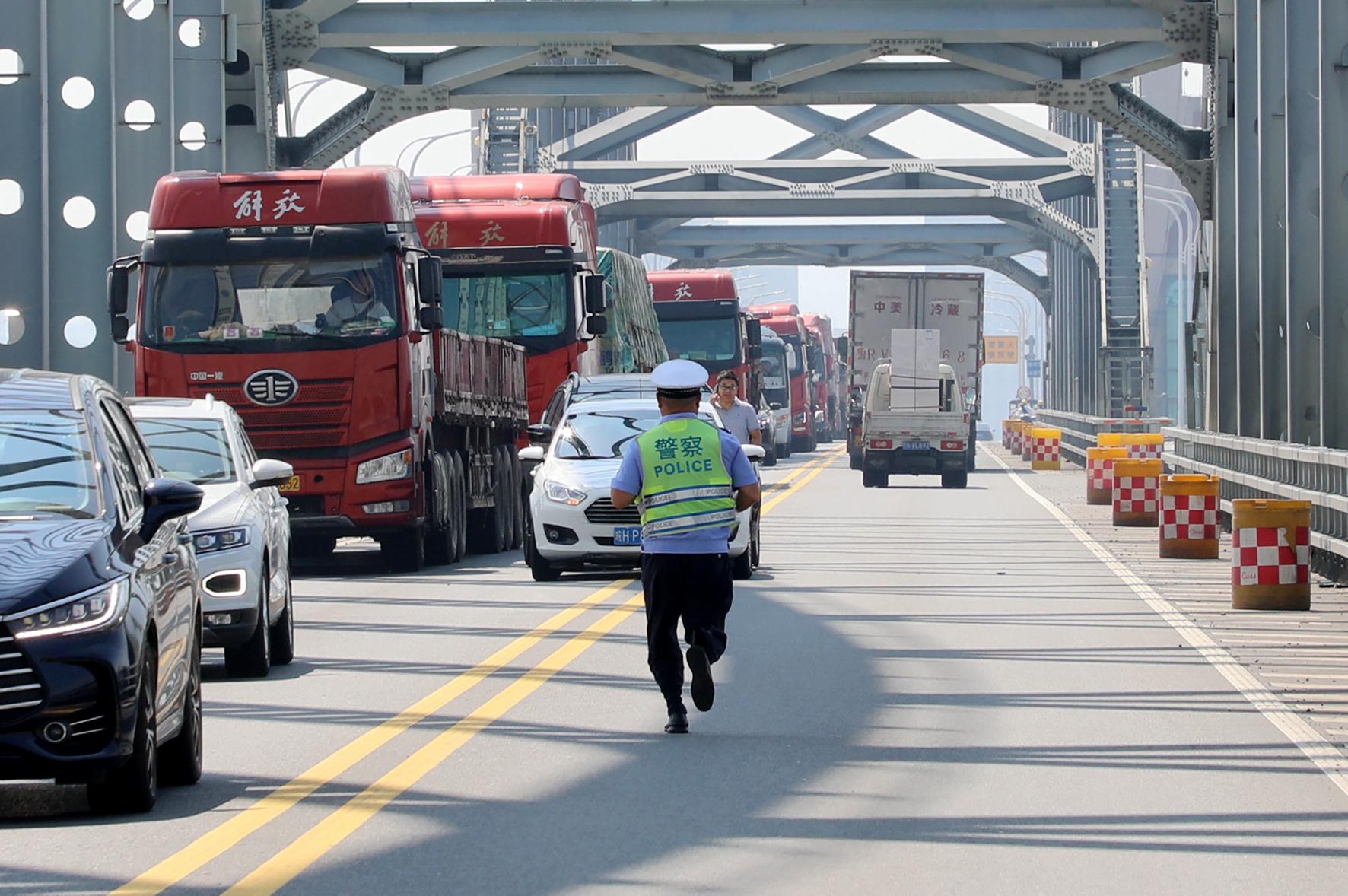 9月17日,江西省九江市公安局交管支隊第一大隊民警快速奔向九江長江一橋一起交通事故現(xiàn)場。