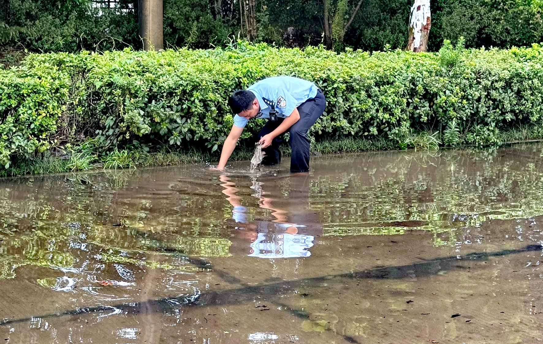 9月17日,安徽省當(dāng)涂縣公安局年陡派出所民警在積水嚴(yán)重的江東大道徒手清理下水口堵塞的雜物。