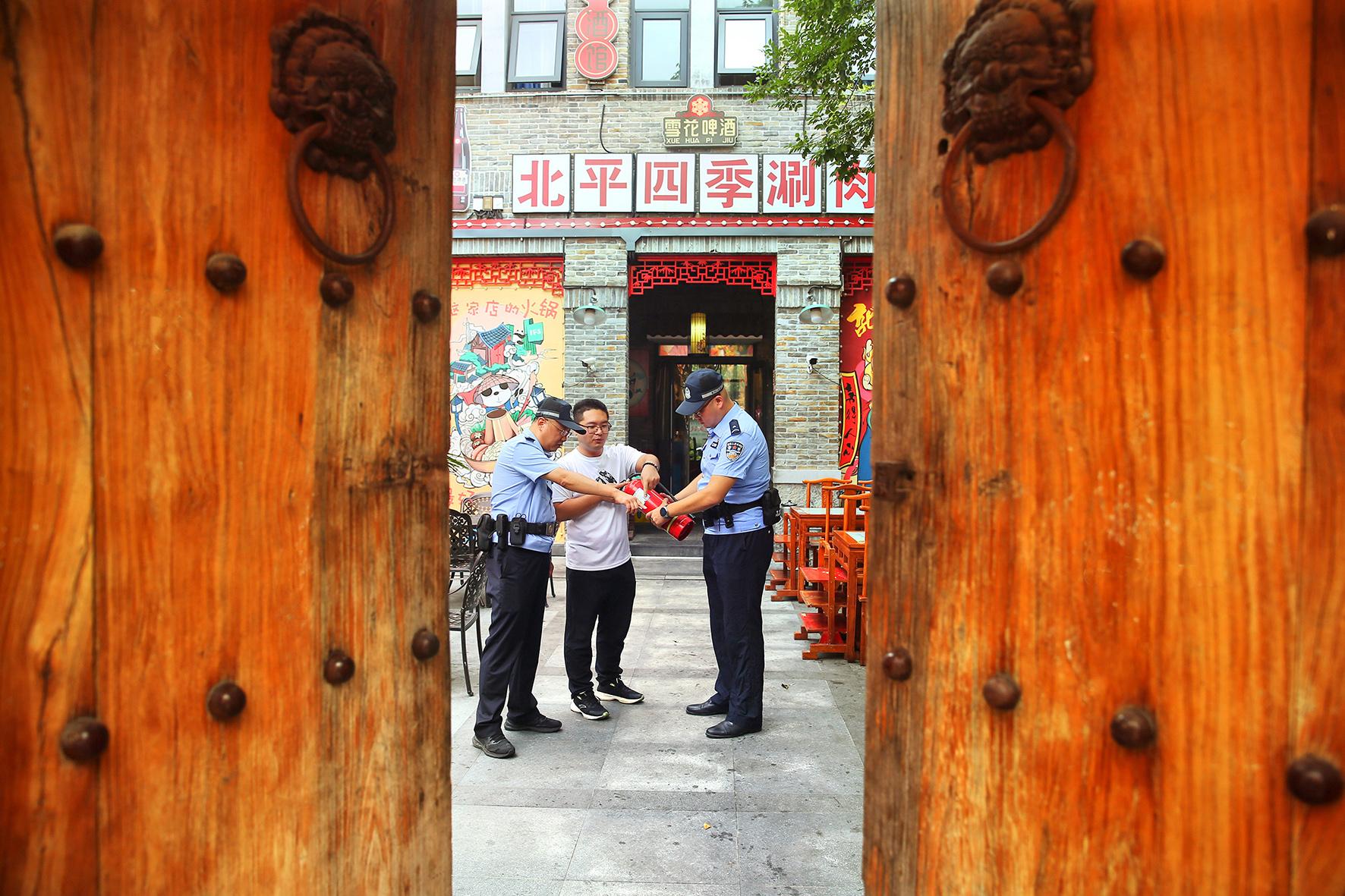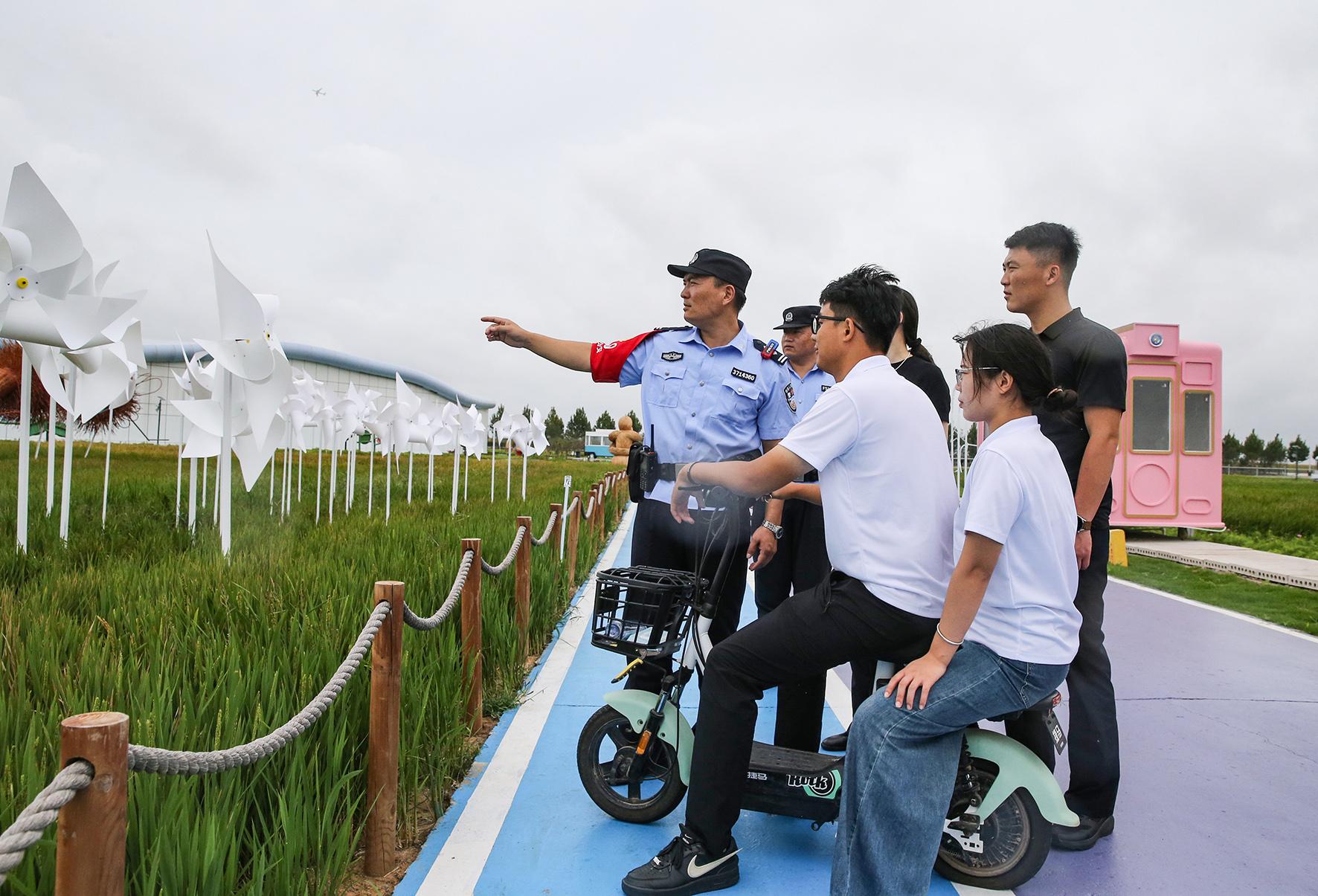 9月17日,山東省臨沂市郯城縣公安局李莊派出所民警輔警在郯城縣醉東風(fēng)鄉(xiāng)村藝棧景點執(zhí)勤巡邏。