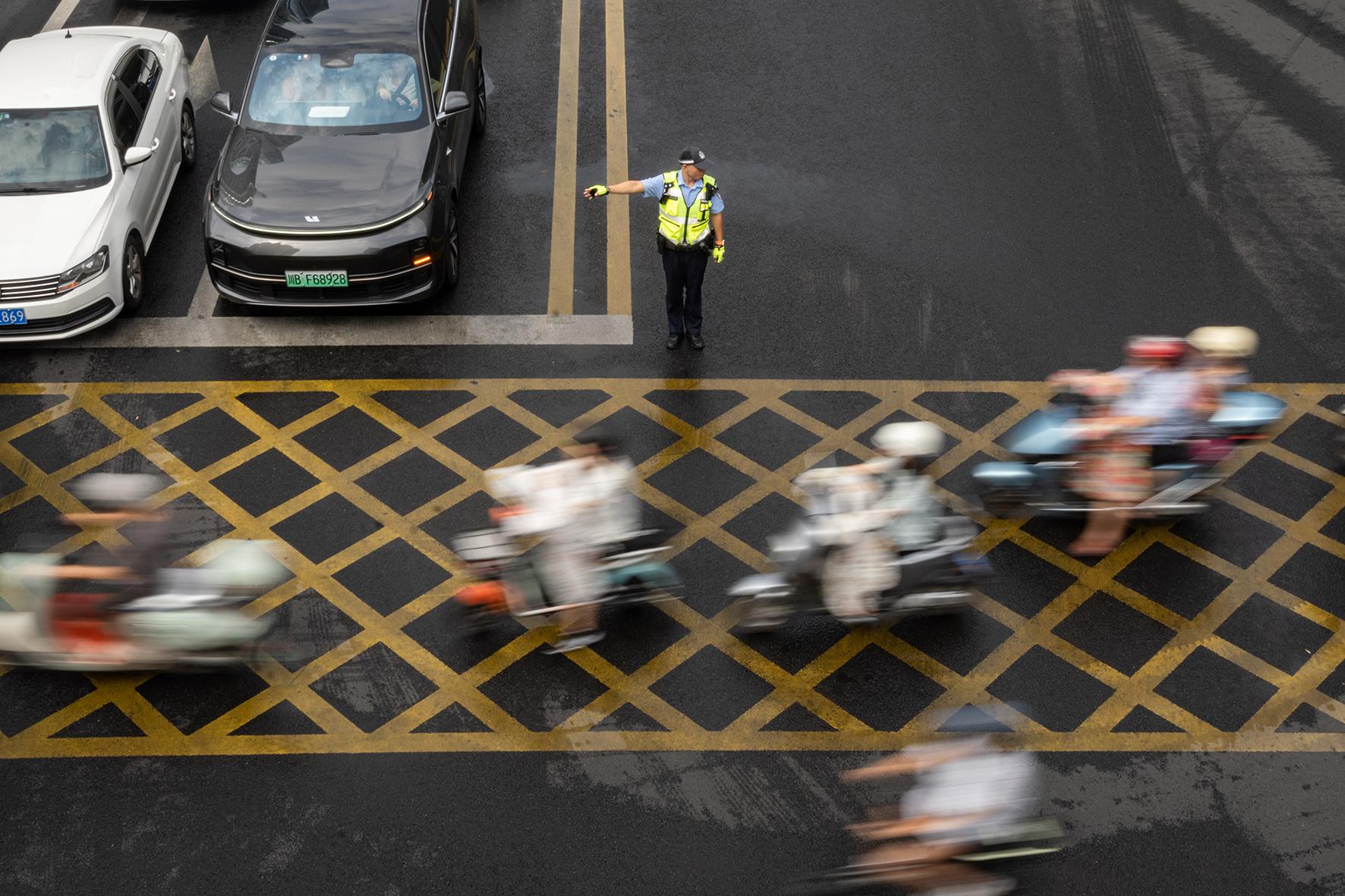 圖為民警在城區(qū)臨園路指揮車輛和行人通行。