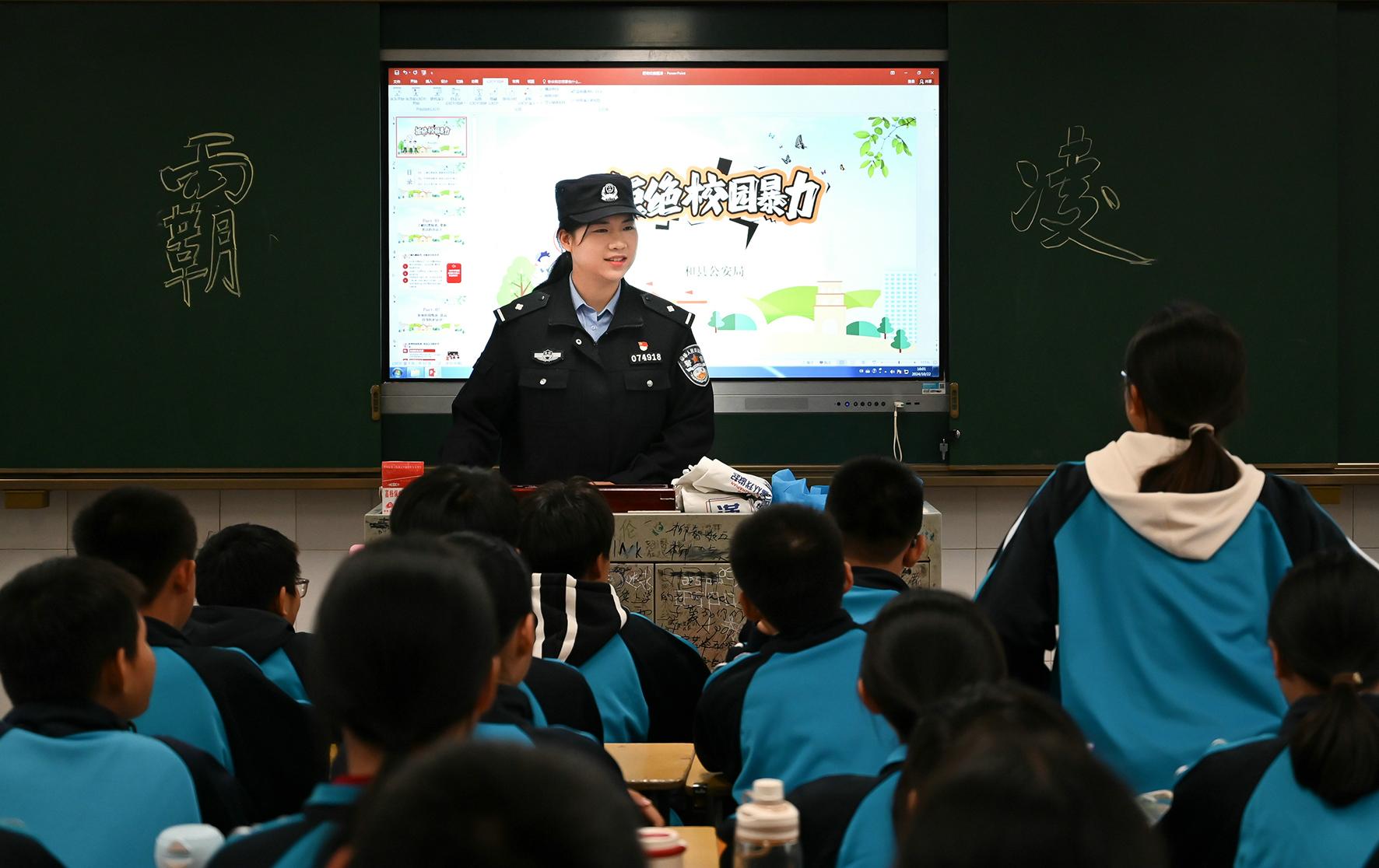 11月4日,安徽省馬鞍山市和縣公安局民警在校園開展“拒絕暴力 反對(duì)校園欺凌”主題班會(huì)。
