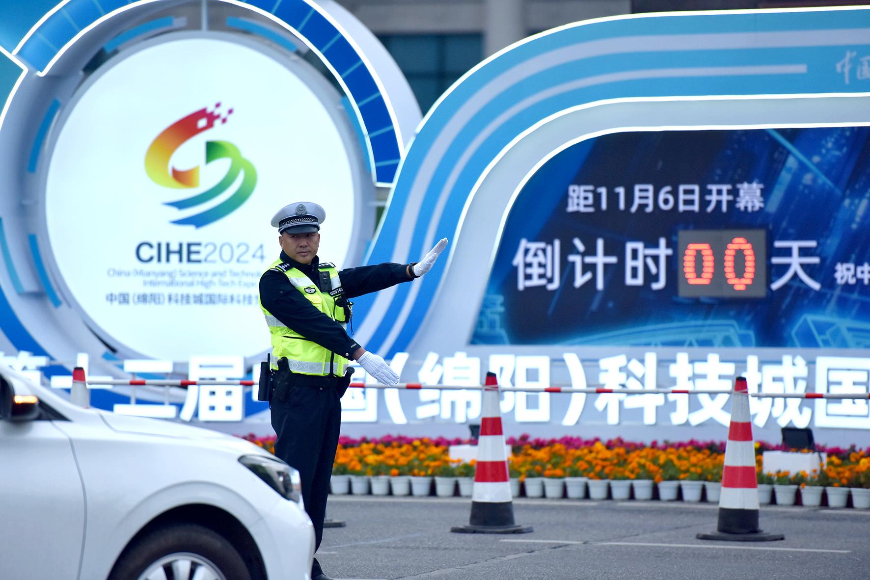 11月6日,第十二屆中國(綿陽)科技城國際科技博覽會開幕。四川省綿陽市公安局交警支隊直屬一大隊科學制定交通組織措施,全員上路指揮疏導,確保道路交通安全暢通。