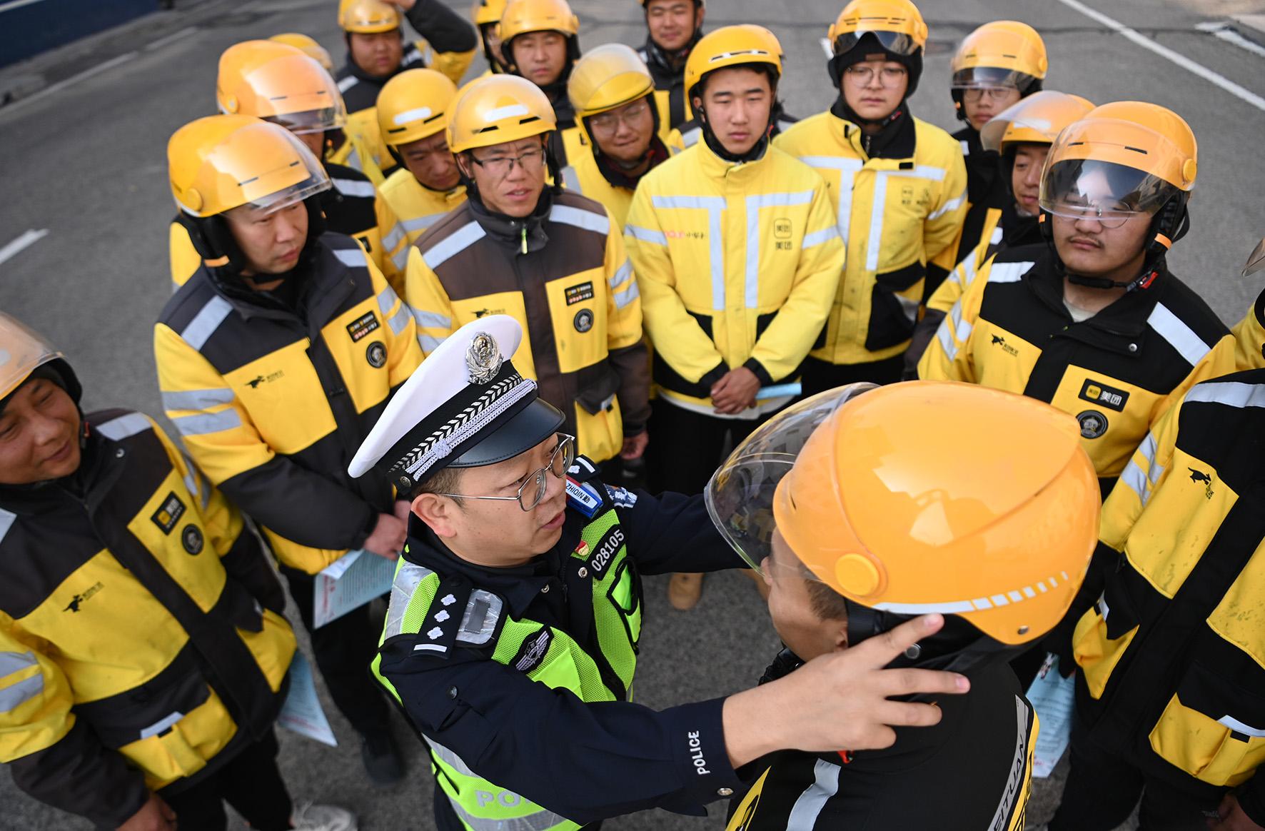 11月8日,山西省大同市廣靈縣公安局交通警察大隊民警對從事外賣送餐的駕駛人進行交通安全知識培訓。