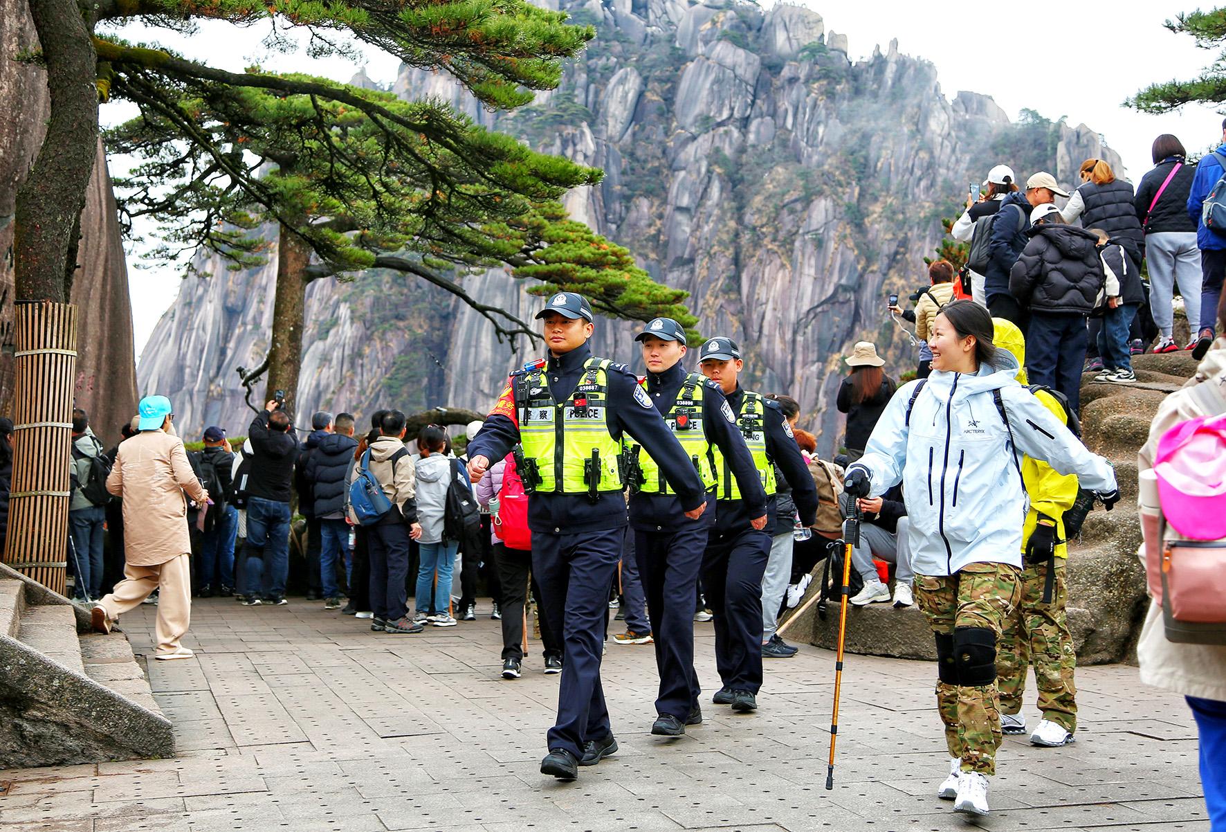 11月19日,安徽省黃山風景區(qū)公安局玉屏樓派出所執(zhí)勤民警輔警在秀美風景中執(zhí)勤,也成為游客眼中的一道亮麗風“警”線。