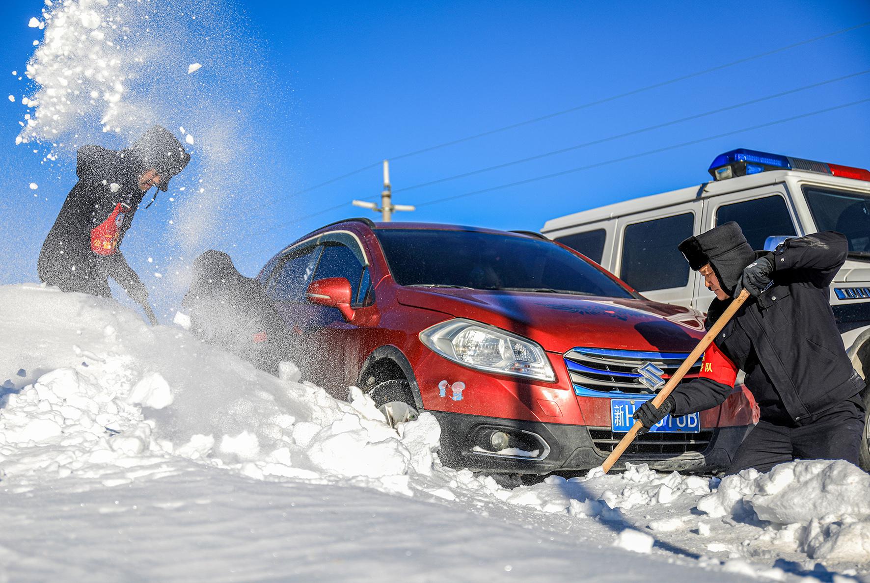 12月5日12時(shí)許,新疆出入境邊防檢查總站阿勒泰邊境管理支隊(duì)庫(kù)衛(wèi)邊境派出所接到群眾求助稱車輛因積雪滑下路基被困。接到求助警情后,巡邏警力第一時(shí)間趕赴現(xiàn)場(chǎng),通過(guò)清挖積雪和警車牽引的方式,成功將被困人員和車輛救出。