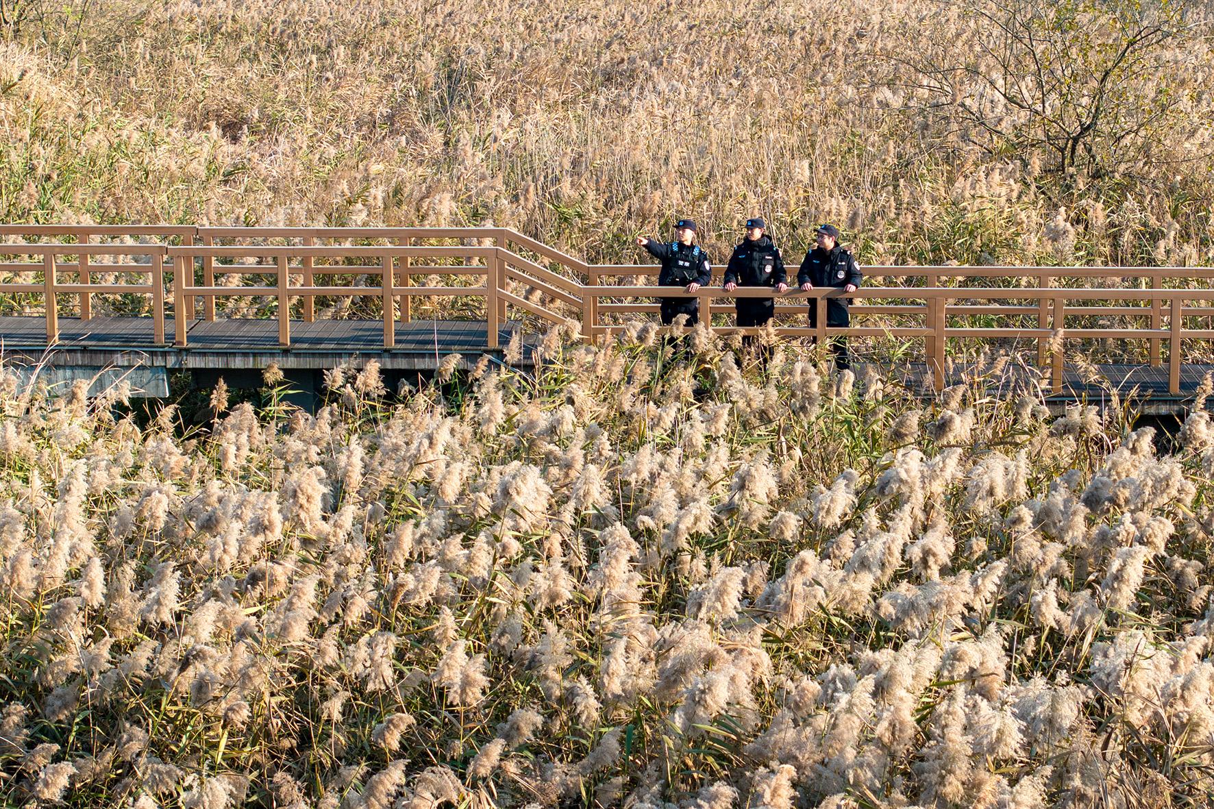 12月16日,浙江省臺州市公安局黃巖分局江口派出所民警在三江口濕地巡邏。近年來,黃巖警方在濕地設(shè)置生態(tài)警務(wù)室,建立天網(wǎng)探頭、無人機(jī)巡邏和警力巡邏相結(jié)合的“生態(tài)警務(wù)”立體屏障,守護(hù)濕地的生態(tài)安全。