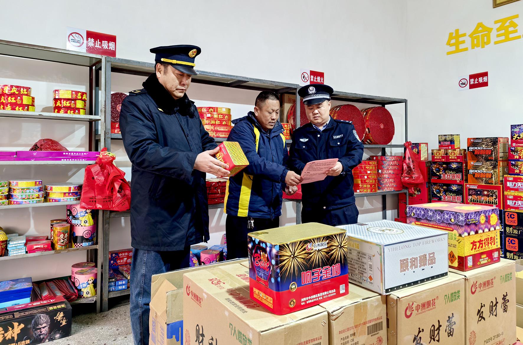 12月25日,山東省棗莊市公安局山亭分局北莊派出所民警和市場監(jiān)督管理人員對轄區(qū)煙花爆竹銷售點開展安全檢查。