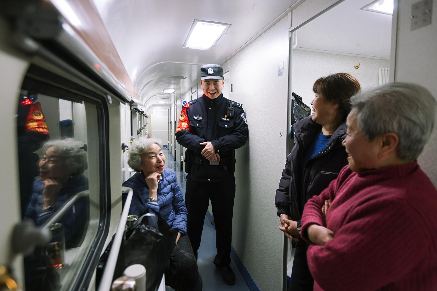 乘警李軼豪在車廂與專程打卡“網(wǎng)紅雙層列車”的旅客交流。