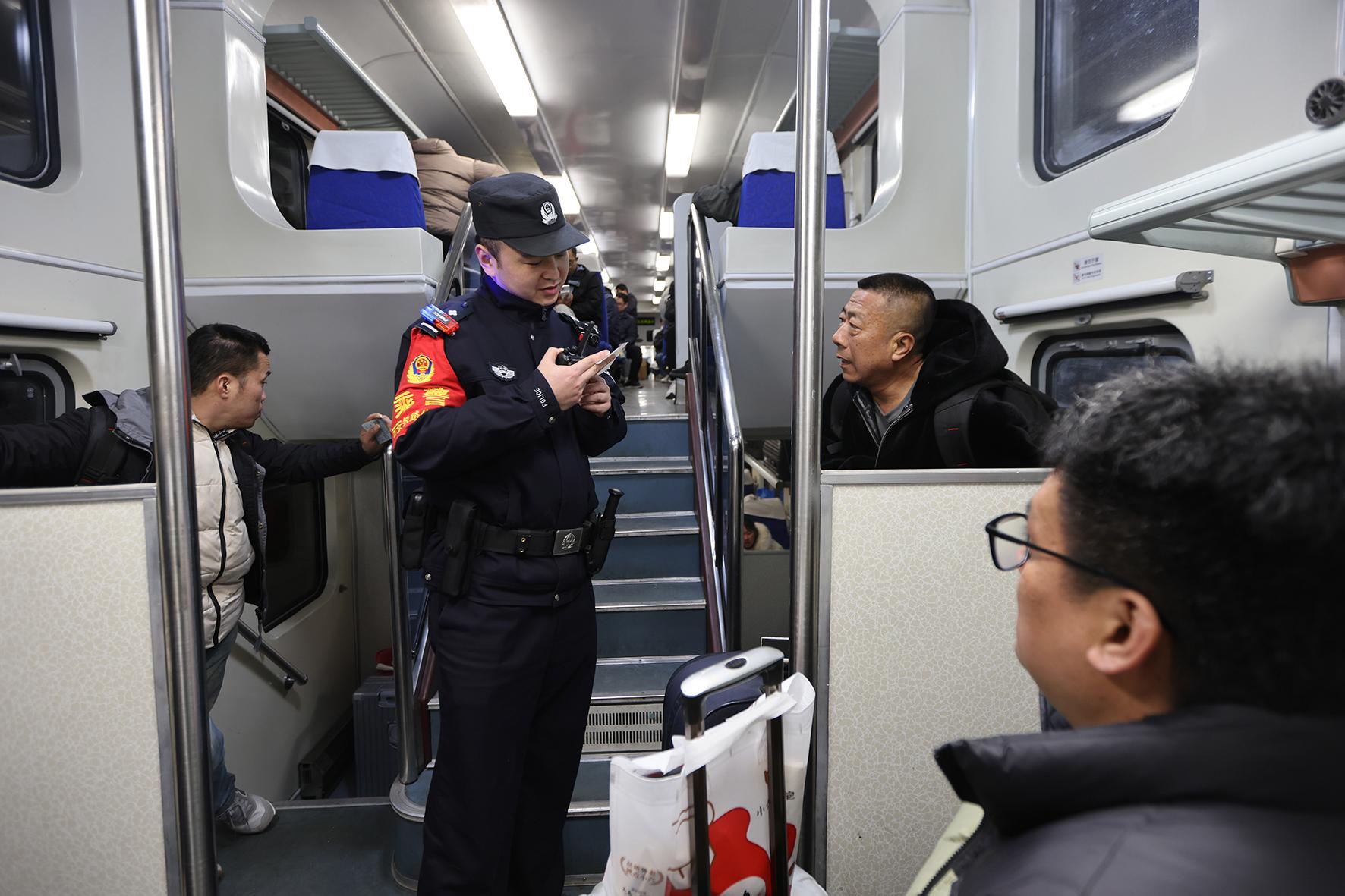 在K1002次列車上,乘警李軼豪在車廂核實信息幫助旅客尋找座位。