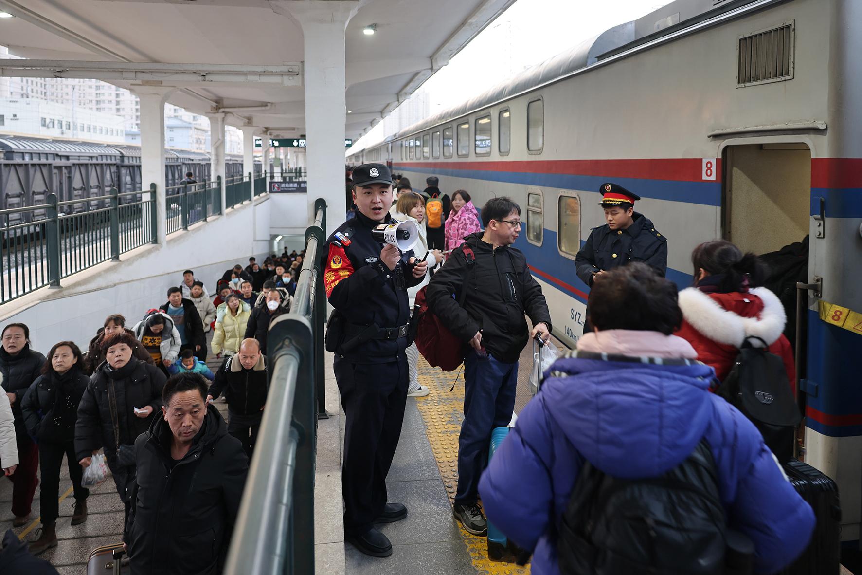 在陜西省寶雞火車站,乘警李軼豪在站臺上疏導(dǎo)客流。