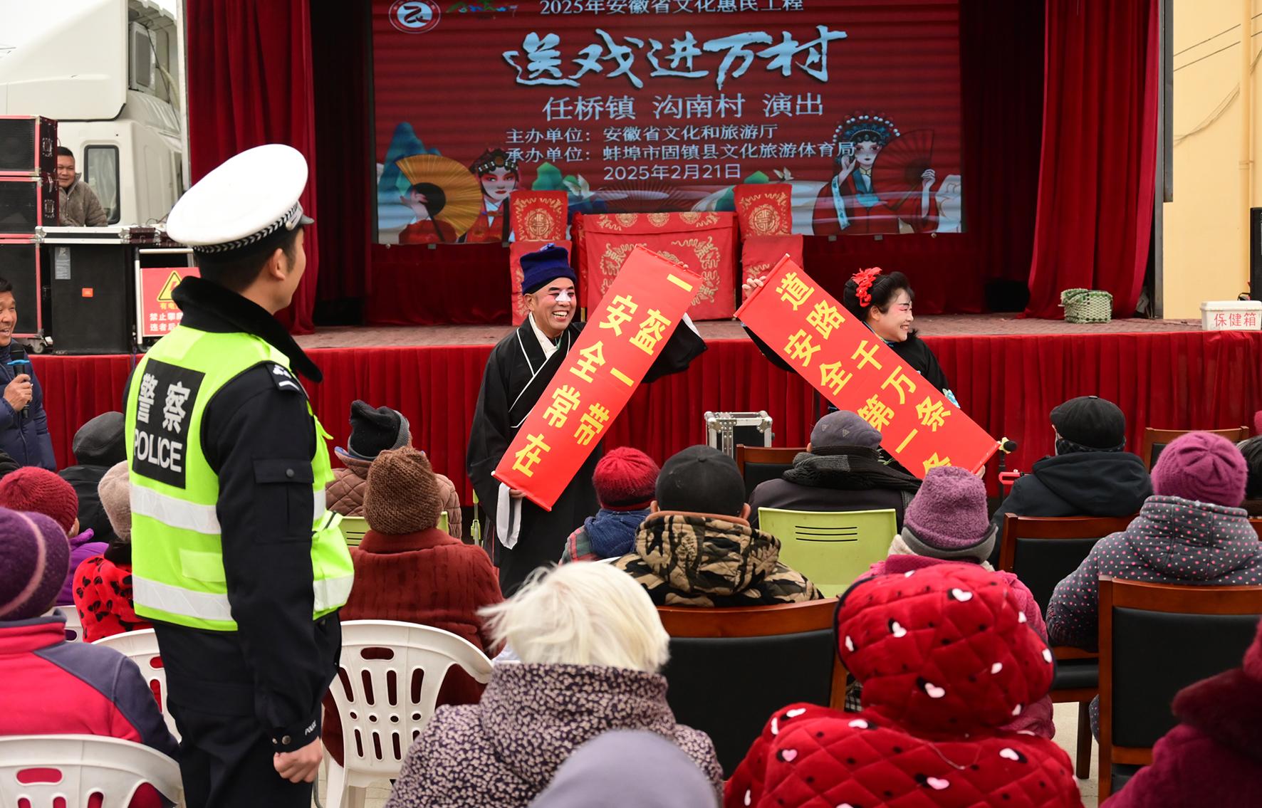 2月21日,安徽省蚌埠市固鎮(zhèn)縣公安局交管大隊組織警力隨“送戲進萬村”活動走進任橋鎮(zhèn)溝南村,開展“美麗鄉(xiāng)村行”交通安全主題宣傳活動。