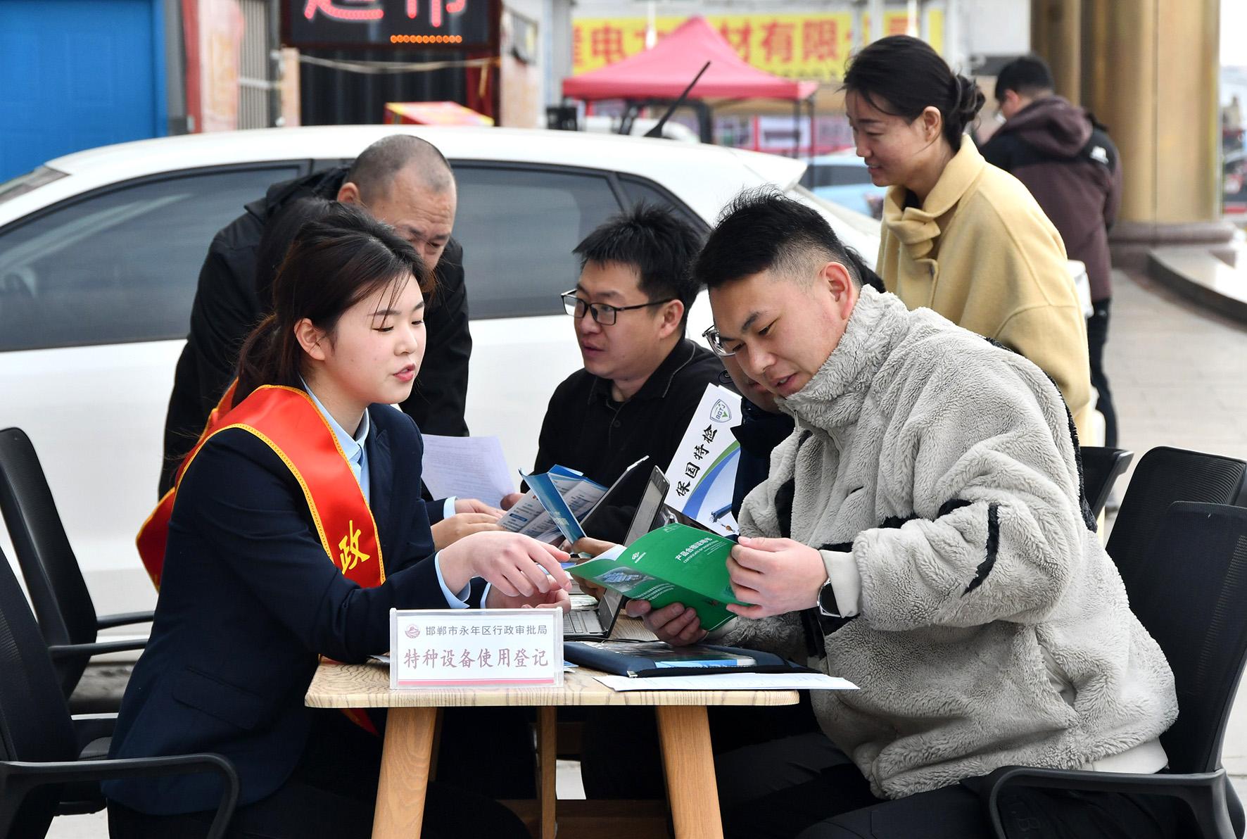 3月14日,河北省邯鄲市永年區(qū)行政審批局把政務(wù)服務(wù)“辦公桌”搬到企業(yè)群眾“家門(mén)口”,組織工作人員深入緊固件產(chǎn)業(yè)聚集區(qū),現(xiàn)場(chǎng)為企業(yè)和群眾集中辦理特種設(shè)備使用登記業(yè)務(wù)。