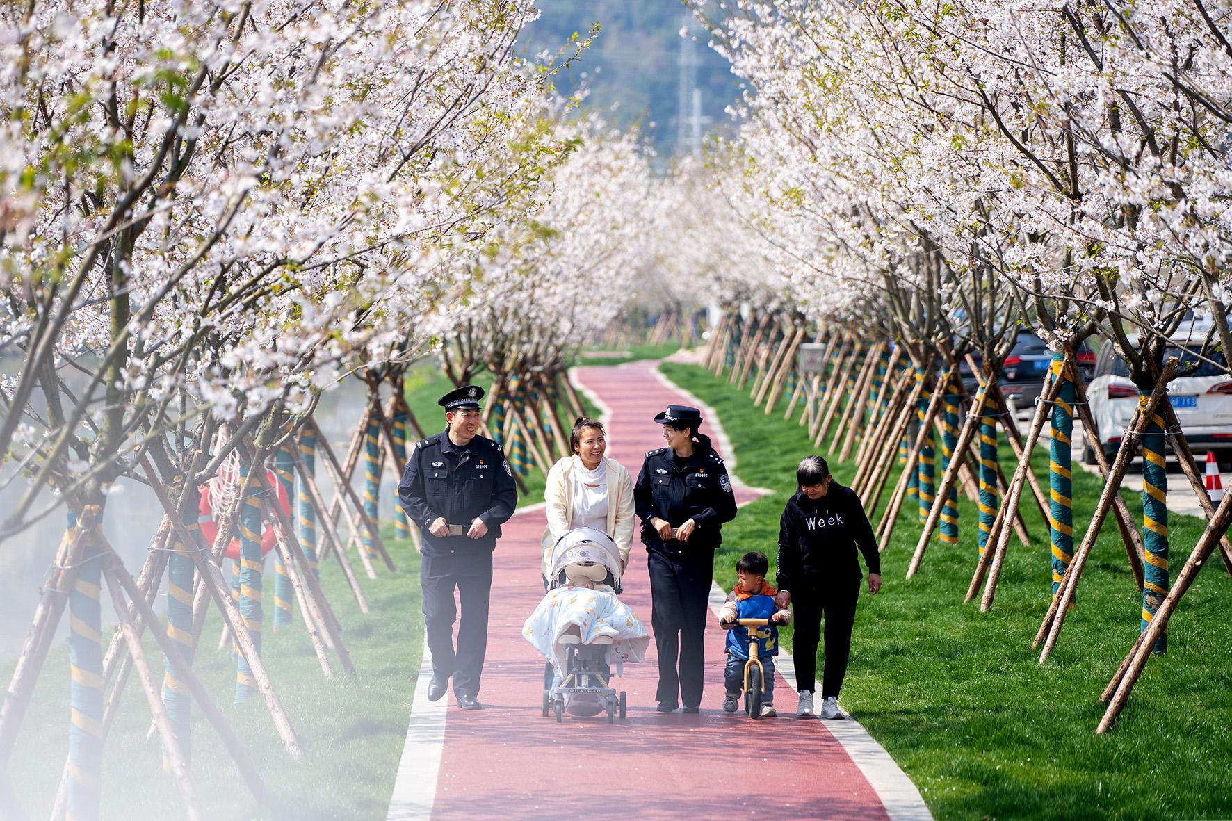 3月20日,浙江省臺(tái)州市公安局黃巖分局城東派出所民警在東城綠道櫻花樹下巡邏執(zhí)勤,服務(wù)游客。