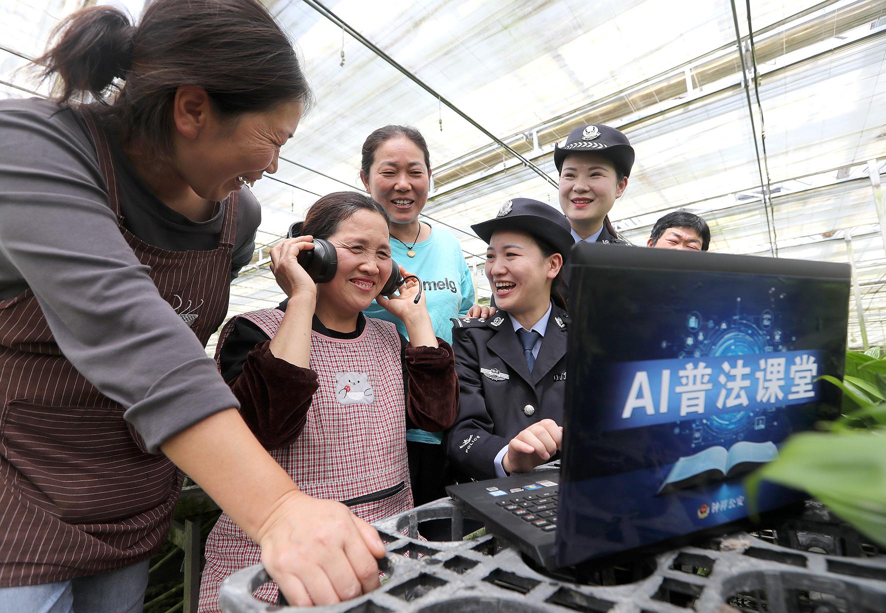 圖為4月15日,民警在柴湖鎮(zhèn)羅城村花卉大棚通過(guò)AI普法課堂進(jìn)行普法宣傳。