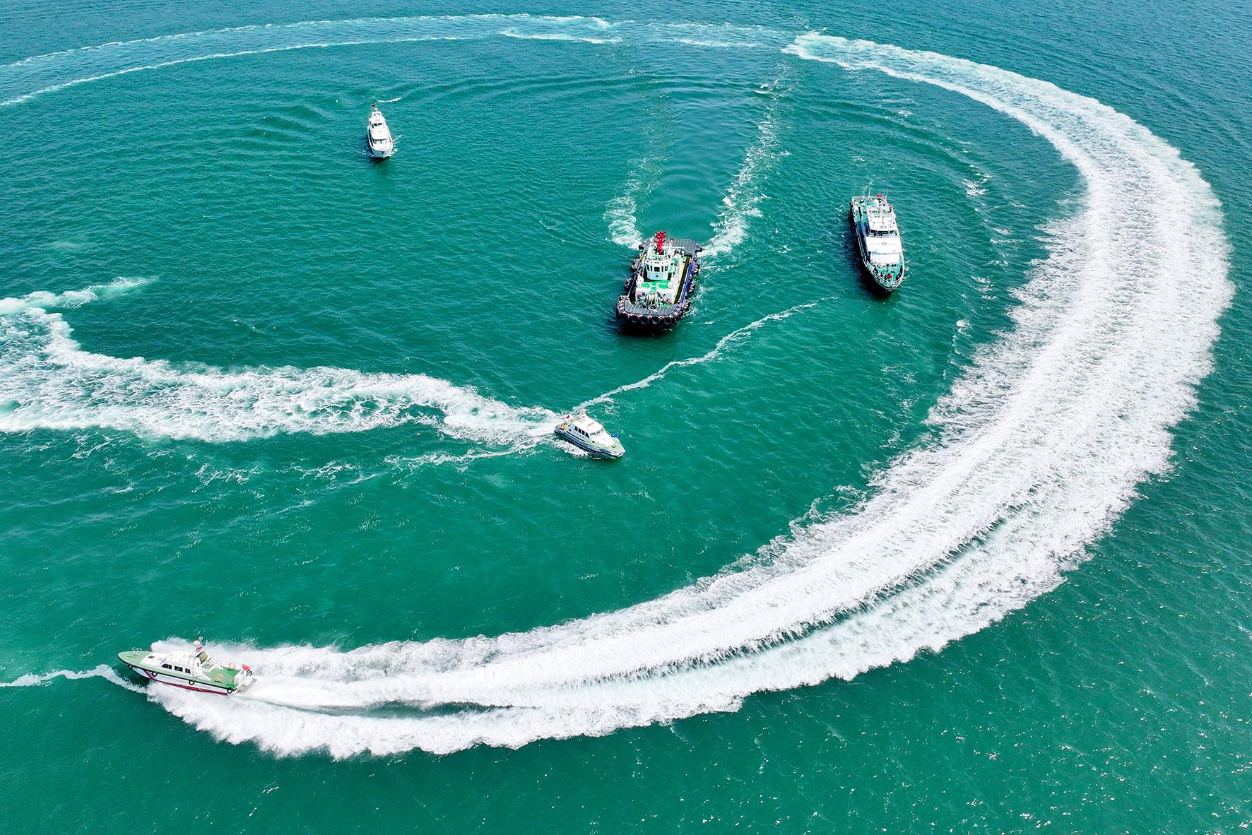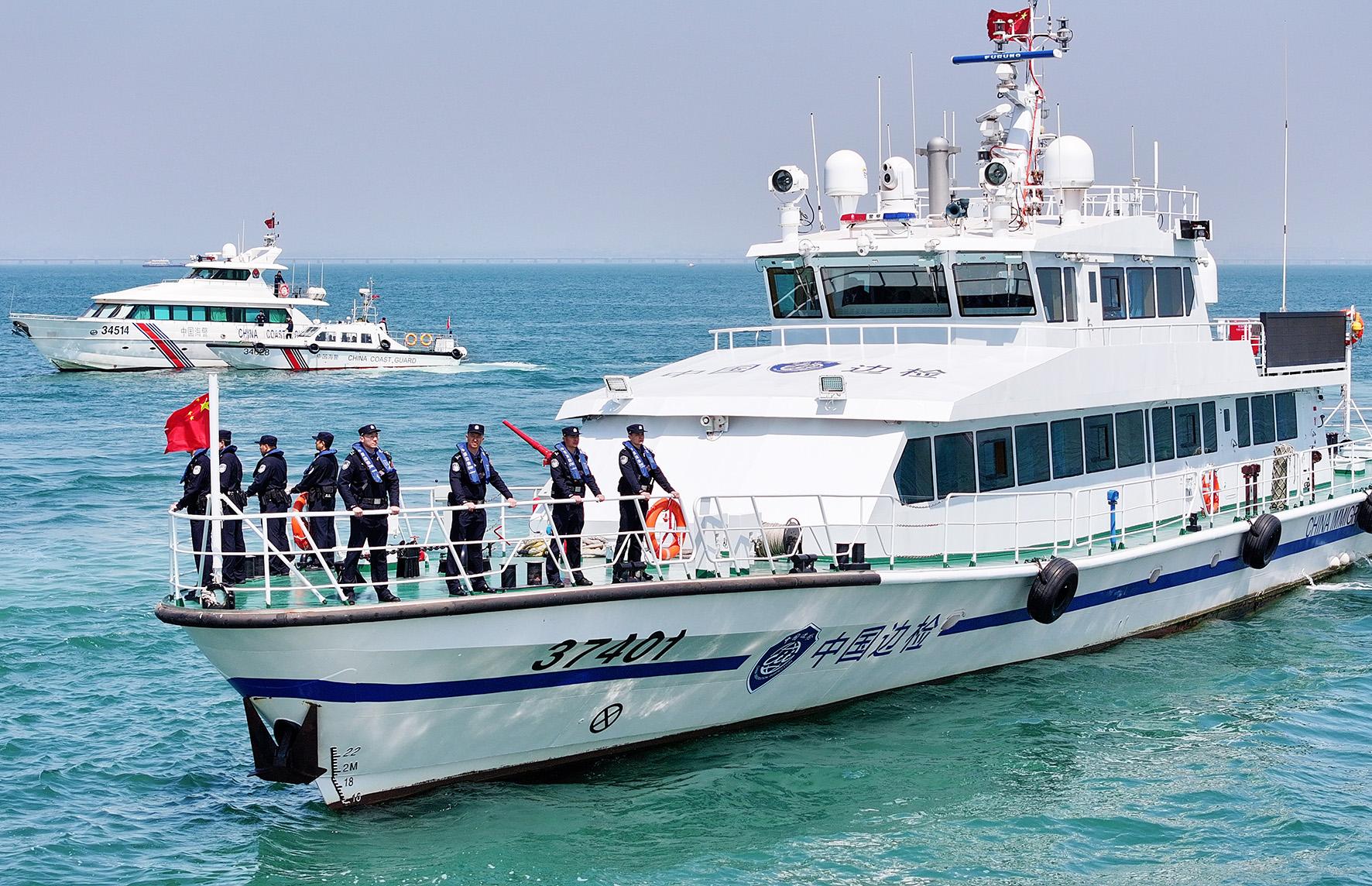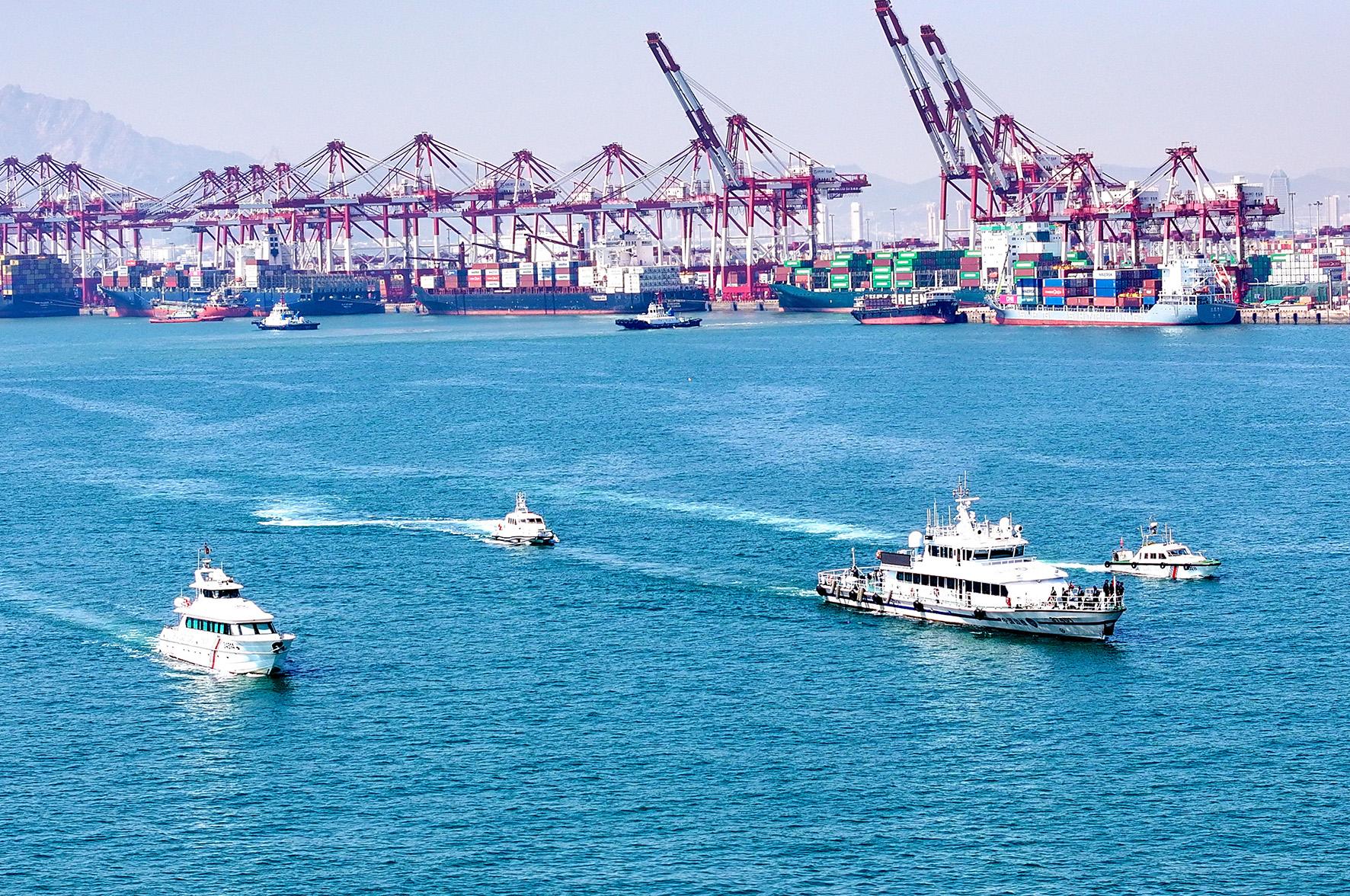 4月15日,山東青島開(kāi)展“國(guó)門(mén)利劍2025”首次海陸空聯(lián)合執(zhí)法行動(dòng)。黃島邊檢站聯(lián)合海事、海警、港航公安等涉海部門(mén),對(duì)青島港及周邊海域?qū)嵤┝Ⅲw巡查。