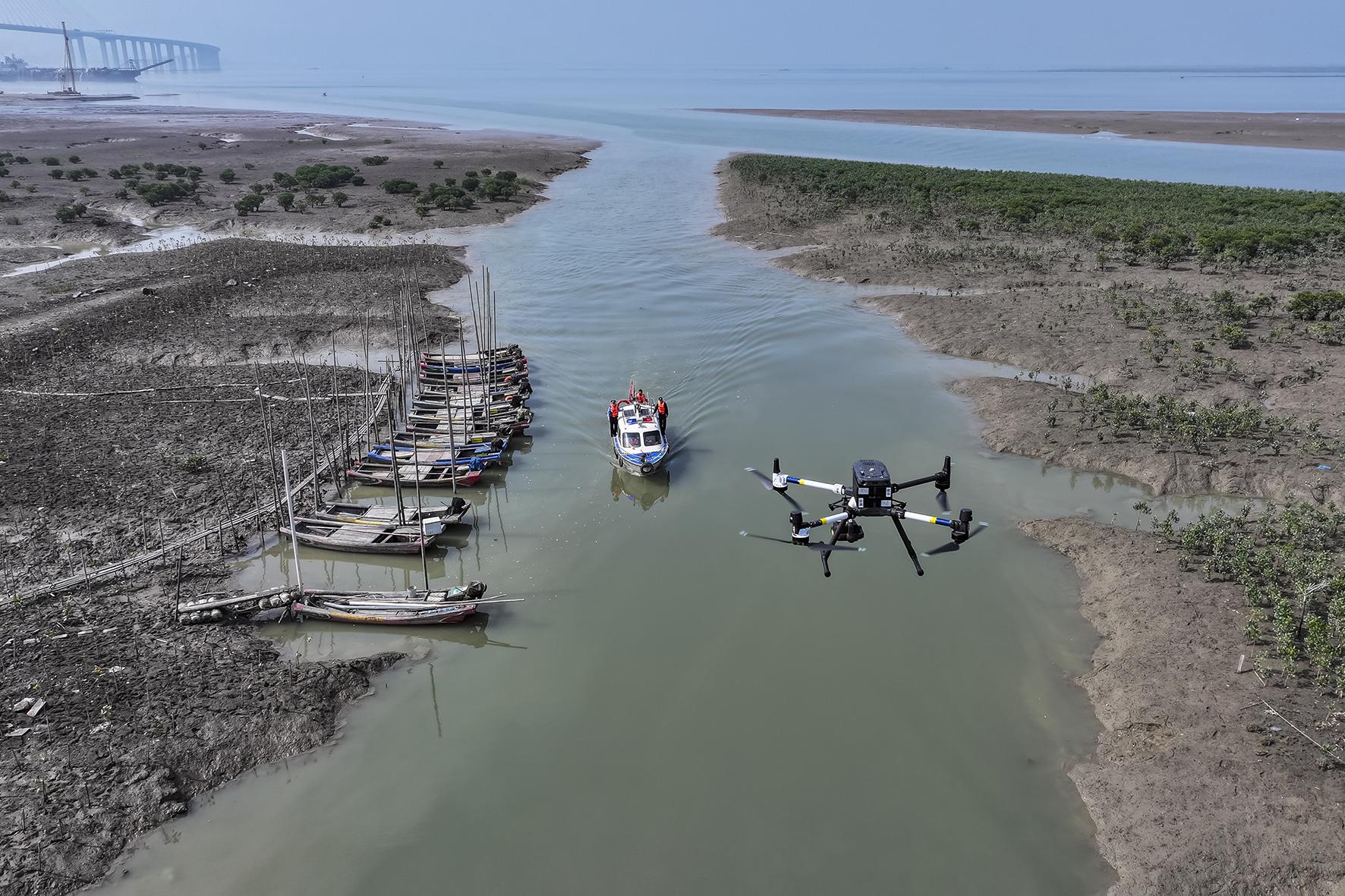 4月22日,福建省漳州市公安局臺商投資區(qū)分局民警和聯(lián)勤單位人員,運用巡邏艇+無人機等方式,對九龍江入海口北岸濕地生態(tài)進行安全巡查。