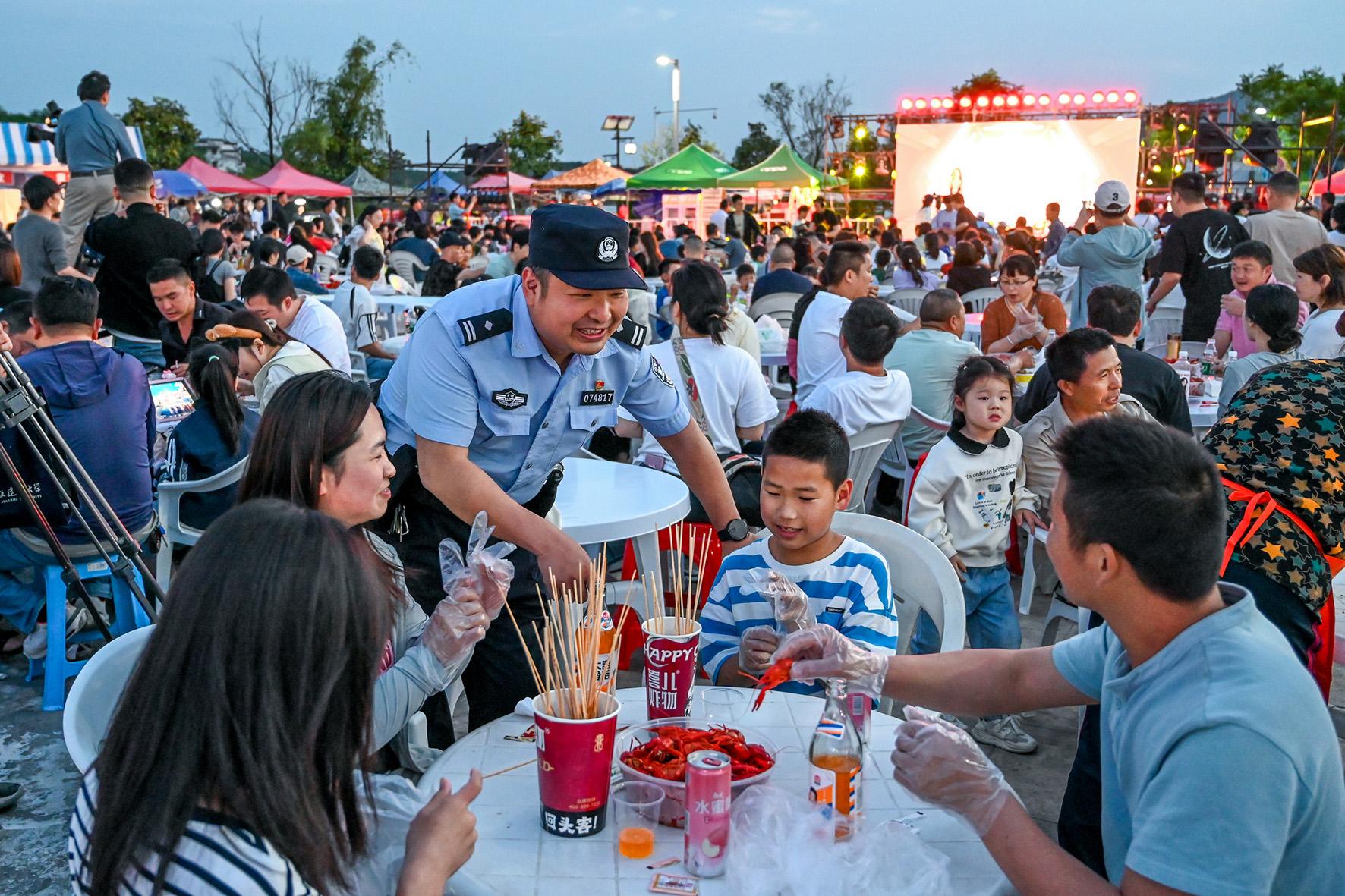 5月4日,安徽省馬鞍山市和縣公安局民警在“龍蝦啤酒音樂美食季”現(xiàn)場為游客提供安全出行咨詢服務(wù)。