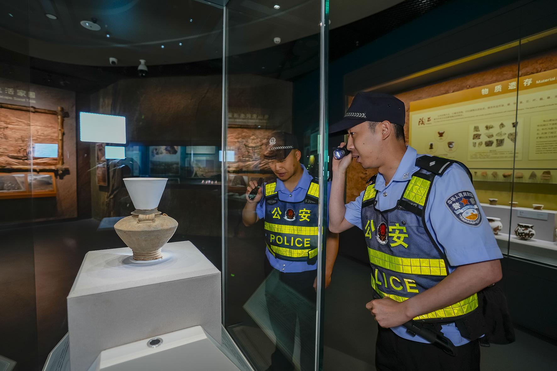 圖為5月29日,民警在殼丘頭遺址博物館開展安全檢查。