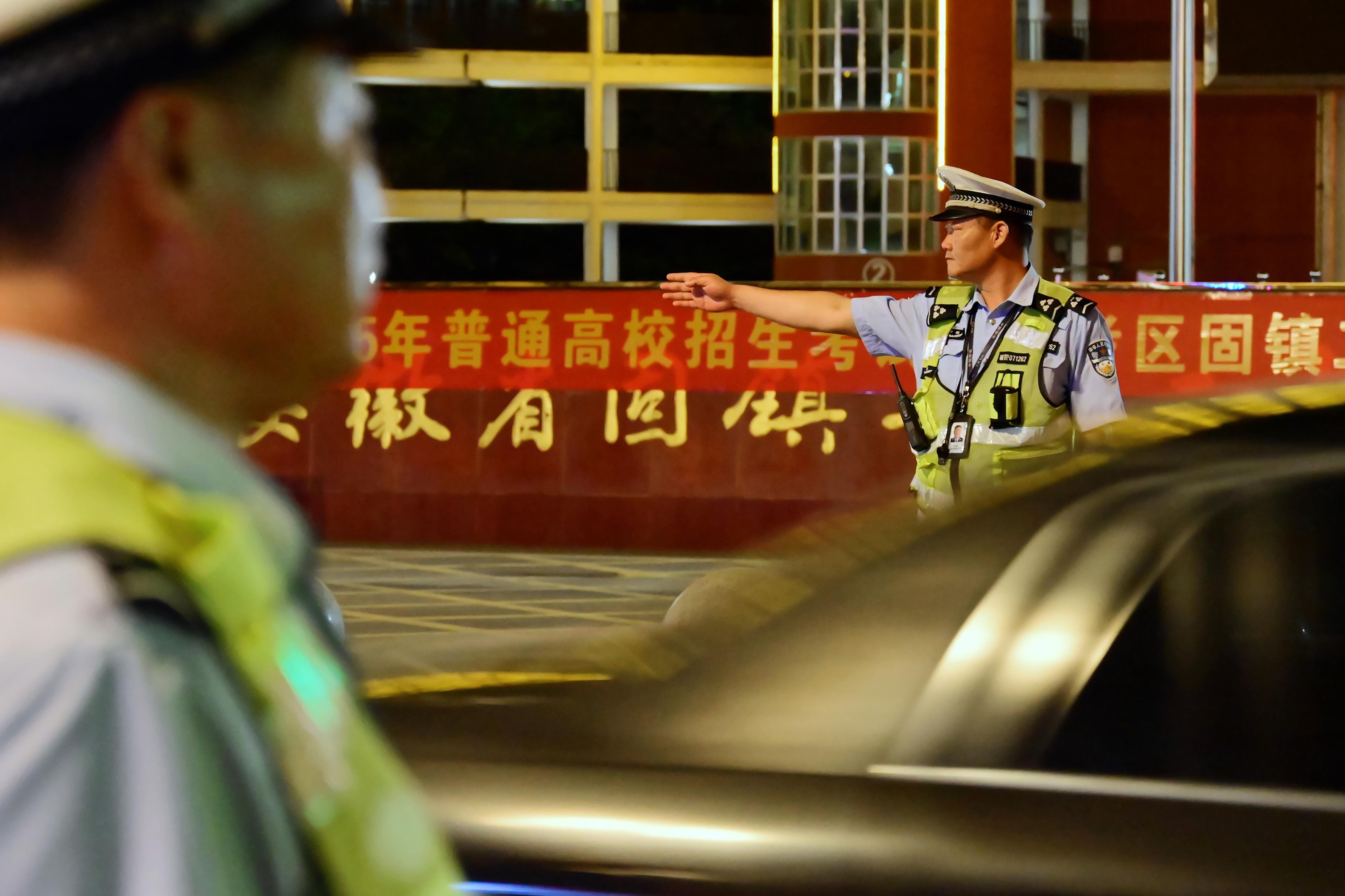 6月4日,安徽省固鎮(zhèn)縣公安局交管大隊(duì)輔警在高考考點(diǎn)執(zhí)勤。