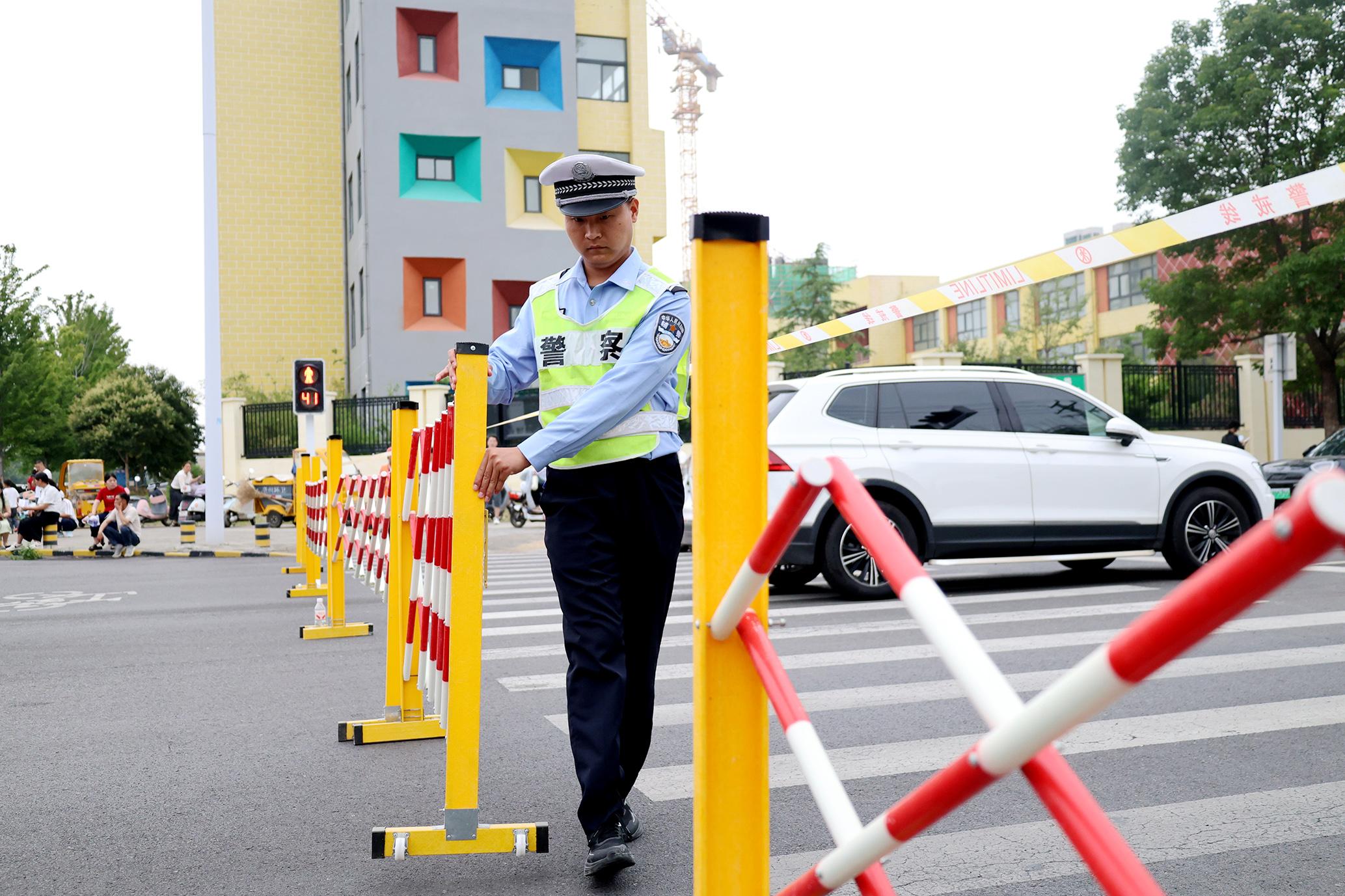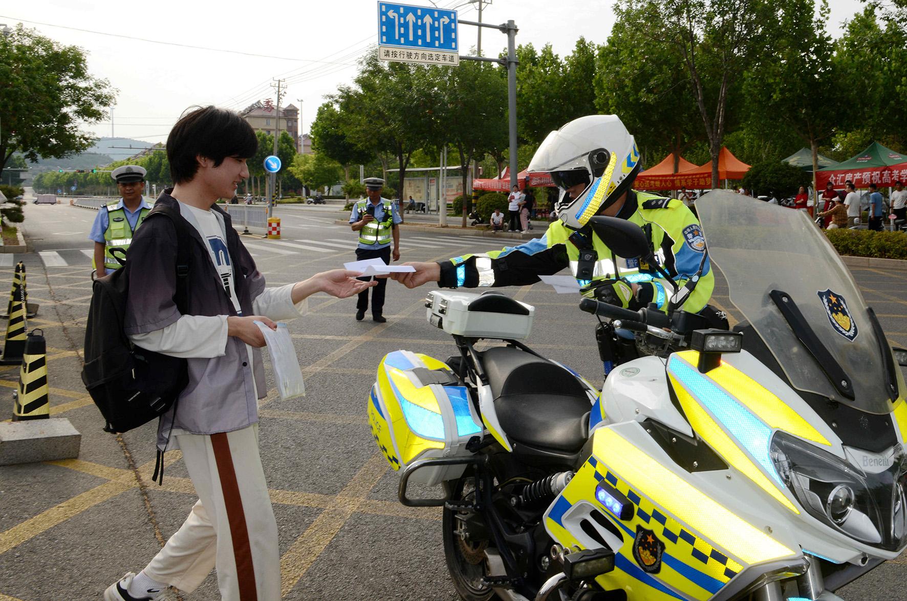 6月7日,江蘇省宜興市公安局環(huán)科園派出所社區(qū)民警在宜興市第二高級(jí)中學(xué)考點(diǎn)為考生護(hù)航加油。