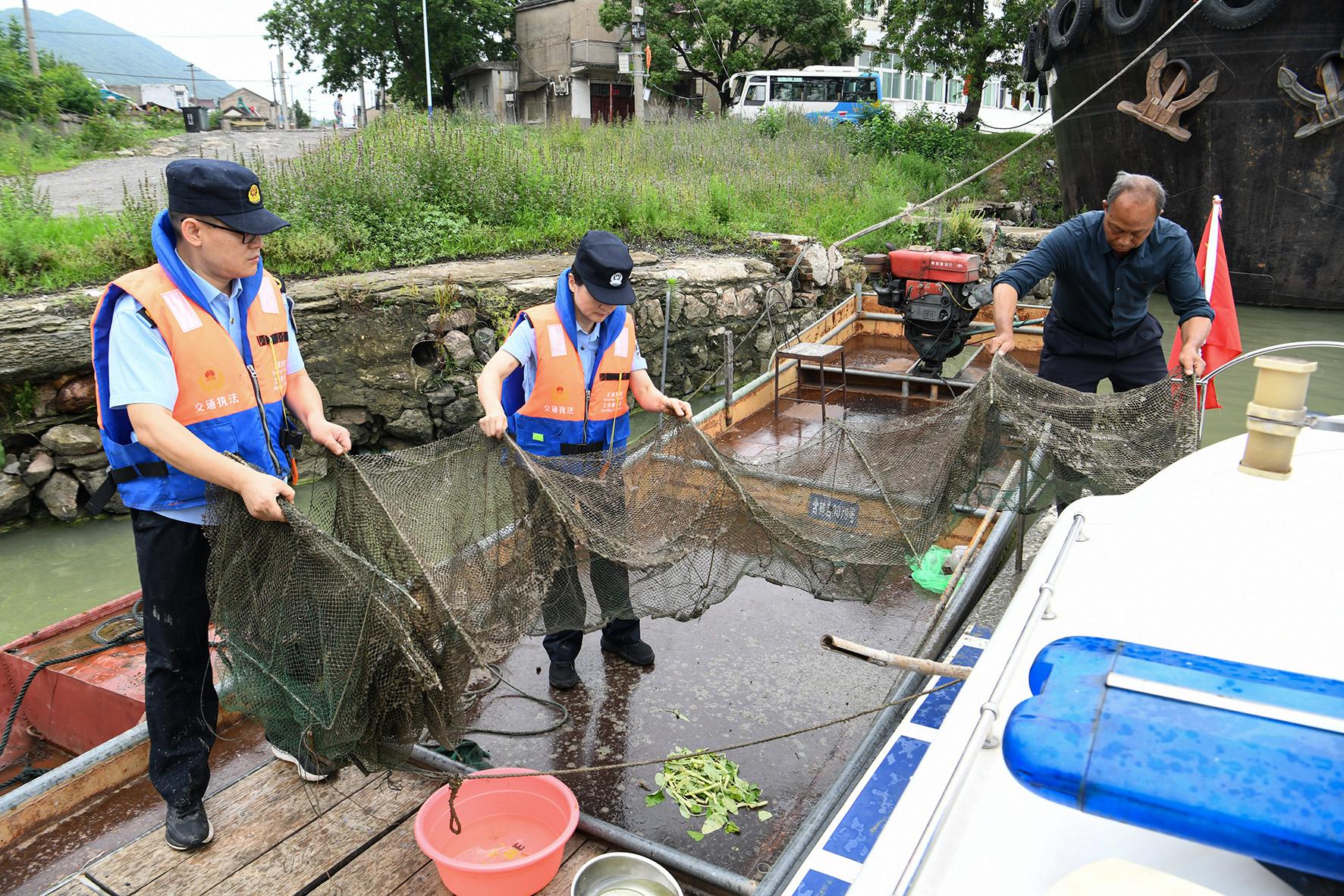 圖為民警對打撈出的地籠網(wǎng)進行收繳。
