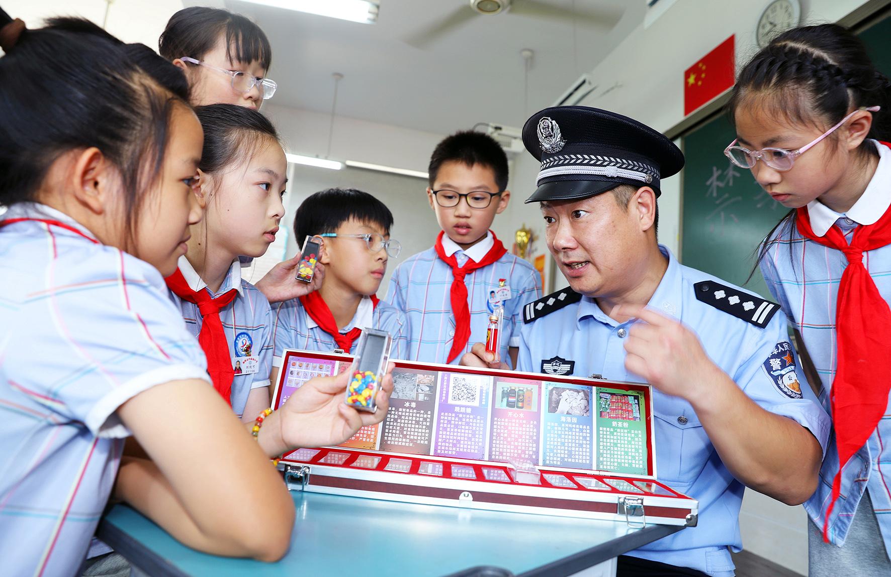 6月17日,浙江省臺(tái)州市路橋區(qū)桐嶼派出所民警在路橋區(qū)外國語小學(xué)向小朋友講解毒品的危害。
