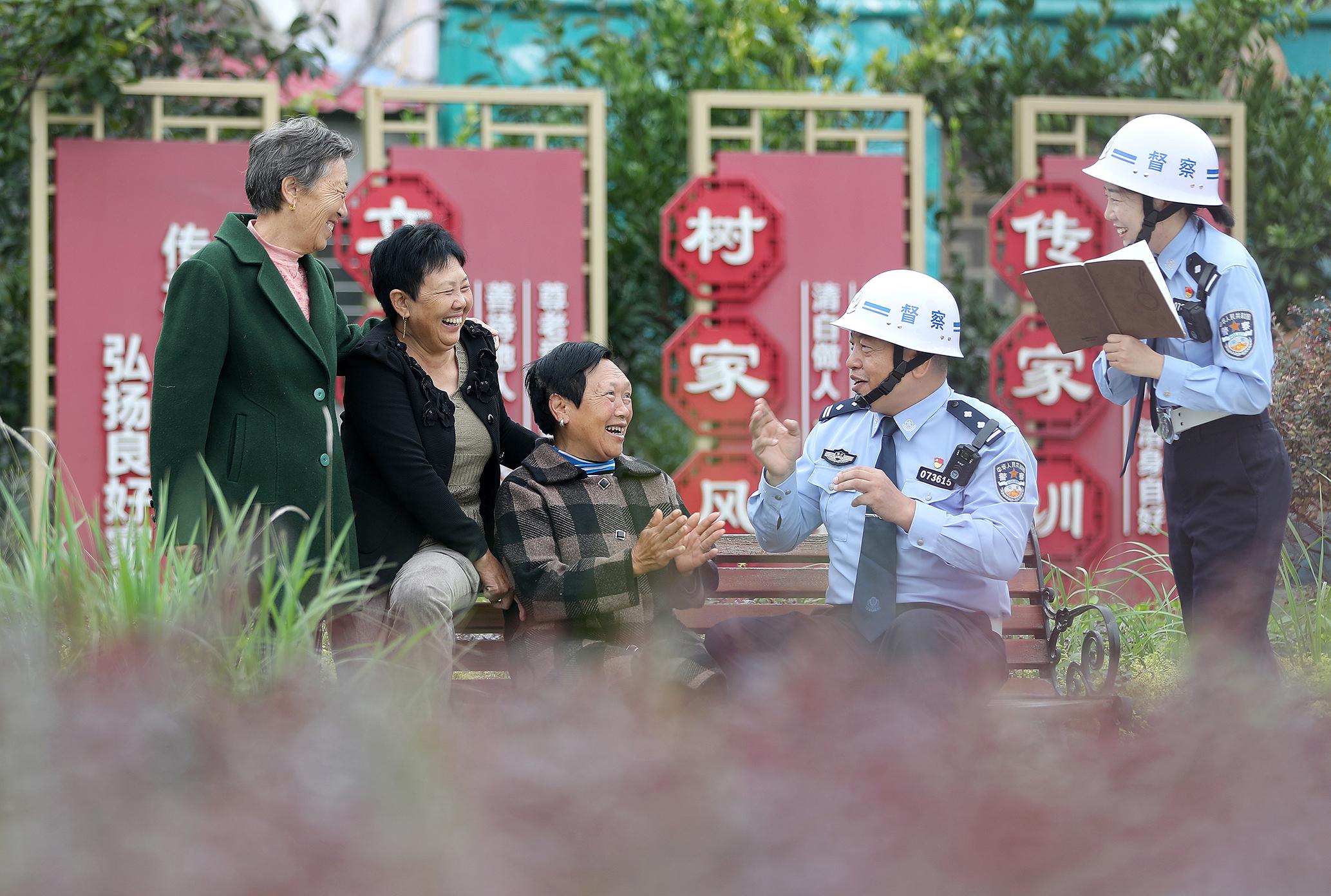 9月22日,在湖北省荊門市沙洋縣三峽土家族村,沙洋縣公安局督察大隊民警與村民“嘮家?!?,傾聽群眾對公安服務(wù)的需求與建議。