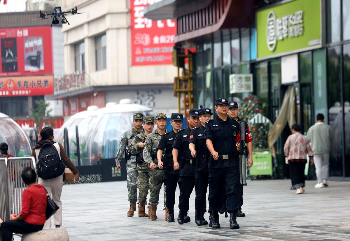 10月1日,安徽省舒城縣公安局特巡警聯合武警在商圈開展巡邏。