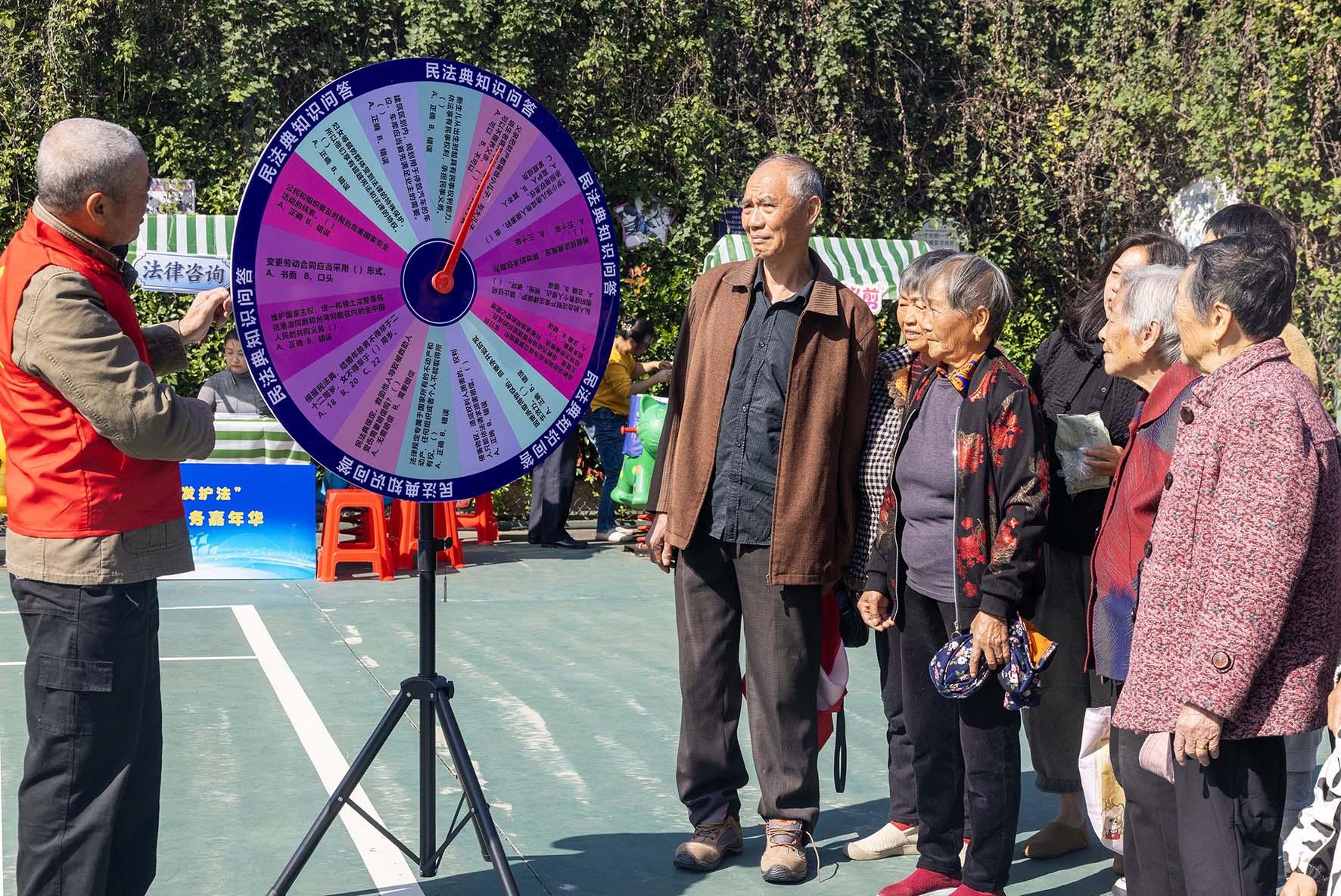 圖為普法志愿者給社區(qū)居民普及民法典知識(shí)。