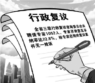 目前,全省三級(jí)行政復(fù)議咨詢委員會(huì)共聘請(qǐng)專家1052人,專家咨詢意見(jiàn)采納率達(dá)72.8%,經(jīng)專家咨詢的復(fù)議案件無(wú)一敗訴。