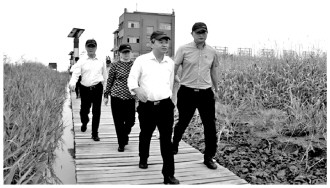 近日,生態(tài)環(huán)境部部長黃潤秋在上海市調(diào)研生態(tài)環(huán)境保護(hù)工作時強調(diào),要堅持精準(zhǔn)治污、科學(xué)治污、依法治污的工作方針,統(tǒng)籌長江口航道資源利用開發(fā)和河口海域生態(tài)環(huán)境保護(hù),努力實現(xiàn)經(jīng)濟效益和生態(tài)效益相統(tǒng)一。圖為黃潤秋(前一)在調(diào)研現(xiàn)場。 (資料圖片)