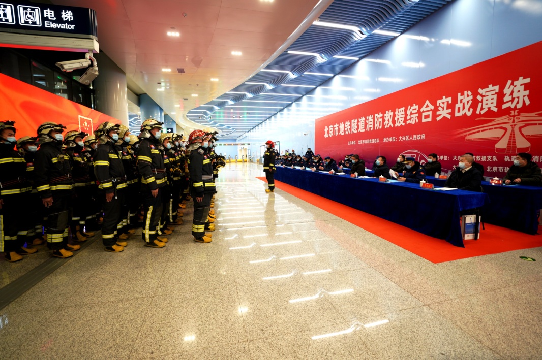 為全力做好2022年春運(yùn)服務(wù)保障工作,防范化解重大安全風(fēng)險(xiǎn),聚焦“全災(zāi)種、大應(yīng)急”救援需要和地鐵隧道火災(zāi)滅火救援處置能力。1月21日凌晨,北京市在北京地鐵大興機(jī)場(chǎng)線大興新城地鐵站組織開展全要素地鐵隧道火災(zāi)滅火救援綜合實(shí)戰(zhàn)演練。演練模擬一列由大興新城地鐵站開往草橋站的地鐵因動(dòng)力電機(jī)故障導(dǎo)致電氣線路起火燃燒,多節(jié)車廂起火,列車、隧道以及車站內(nèi)大量人員被困的情形。北京市消防救援總隊(duì)先后調(diào)集10個(gè)單位、52輛消防車、248名消防救援人員,以及市軌道運(yùn)營(yíng)管理公司、公安、交通、環(huán)衛(wèi)、醫(yī)療、氣象、微型消防站等區(qū)級(jí)社會(huì)聯(lián)動(dòng)力量200余人參演。