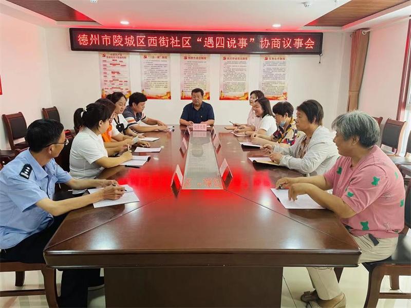 圖為陵城區(qū)建立“遇四說(shuō)事”協(xié)商議事機(jī)制,每月4日、14日、24日由社區(qū)召集居民代表、業(yè)委會(huì)、物業(yè)召開(kāi)會(huì)議,暢通問(wèn)題反饋渠道,共商難題破解辦法