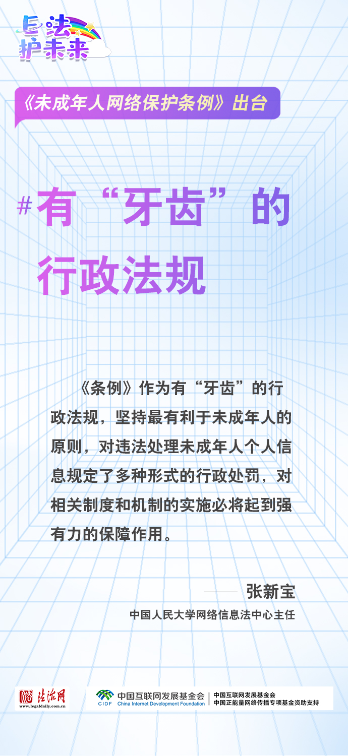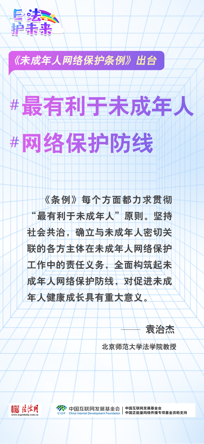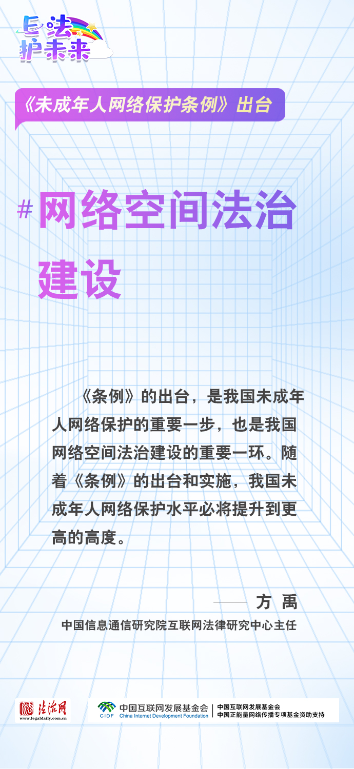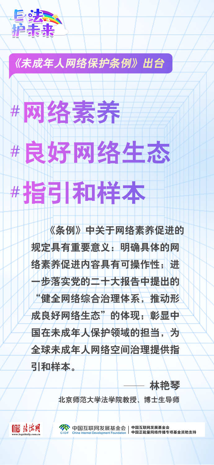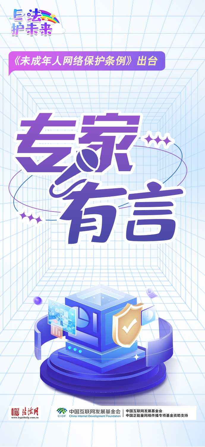 法治網(wǎng)特推出一組“專家有言”海報,內(nèi)容涵蓋《條例》出臺的現(xiàn)實意義和時代價值、網(wǎng)絡(luò)素養(yǎng)促進(jìn)、網(wǎng)絡(luò)信息內(nèi)容規(guī)范、個人信息網(wǎng)絡(luò)保護(hù)、網(wǎng)絡(luò)沉迷防治等,充分展現(xiàn)《條例》的出臺是我國互聯(lián)網(wǎng)治理領(lǐng)域的法治成果,彰顯中國在未成年人網(wǎng)絡(luò)保護(hù)領(lǐng)域的擔(dān)當(dāng),為全球未成年人網(wǎng)絡(luò)空間治理提供指引和樣本。