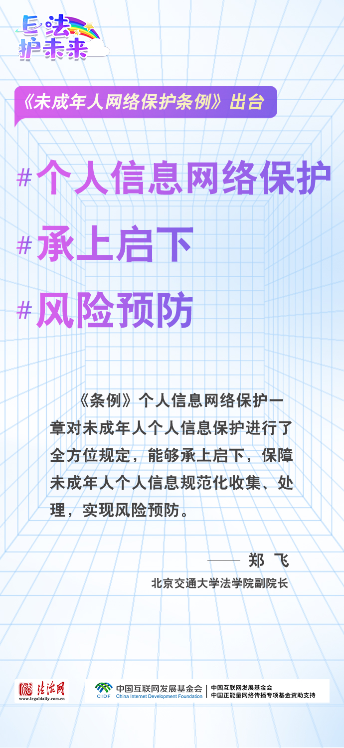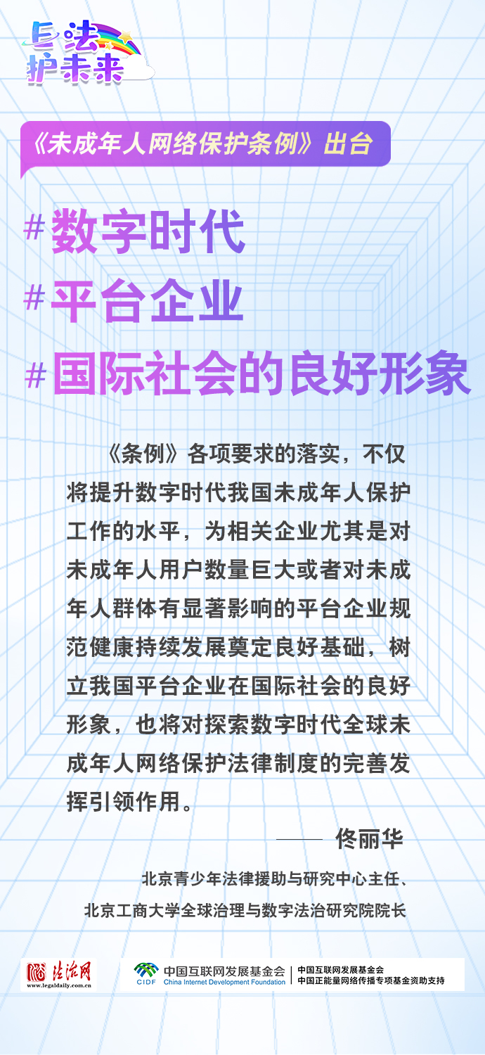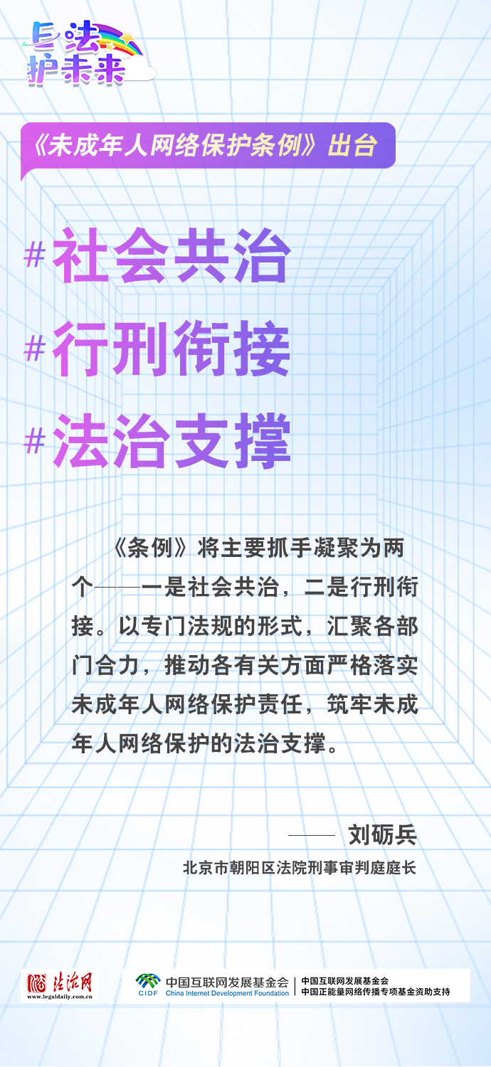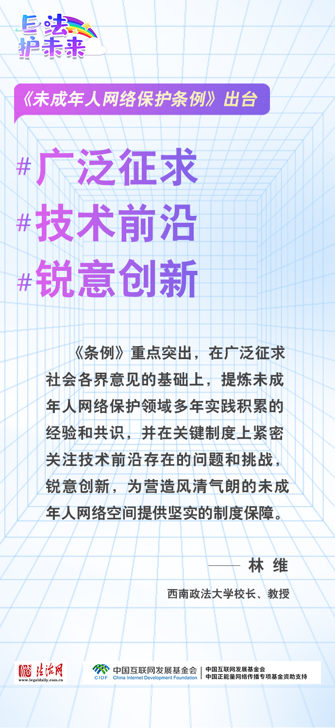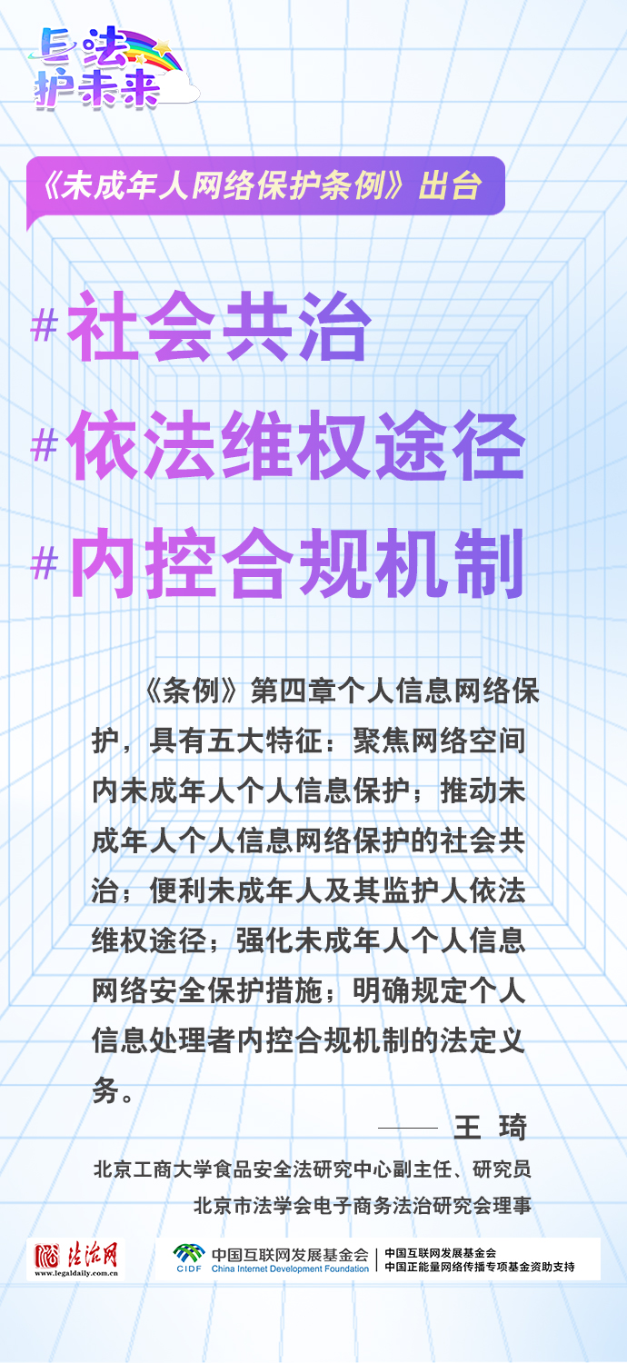 法治網(wǎng)特推出一組“專家有言”海報,內(nèi)容涵蓋《條例》出臺的現(xiàn)實意義和時代價值、網(wǎng)絡(luò)素養(yǎng)促進(jìn)、網(wǎng)絡(luò)信息內(nèi)容規(guī)范、個人信息網(wǎng)絡(luò)保護(hù)、網(wǎng)絡(luò)沉迷防治等,充分展現(xiàn)《條例》的出臺是我國互聯(lián)網(wǎng)治理領(lǐng)域的法治成果,彰顯中國在未成年人網(wǎng)絡(luò)保護(hù)領(lǐng)域的擔(dān)當(dāng),為全球未成年人網(wǎng)絡(luò)空間治理提供指引和樣本。