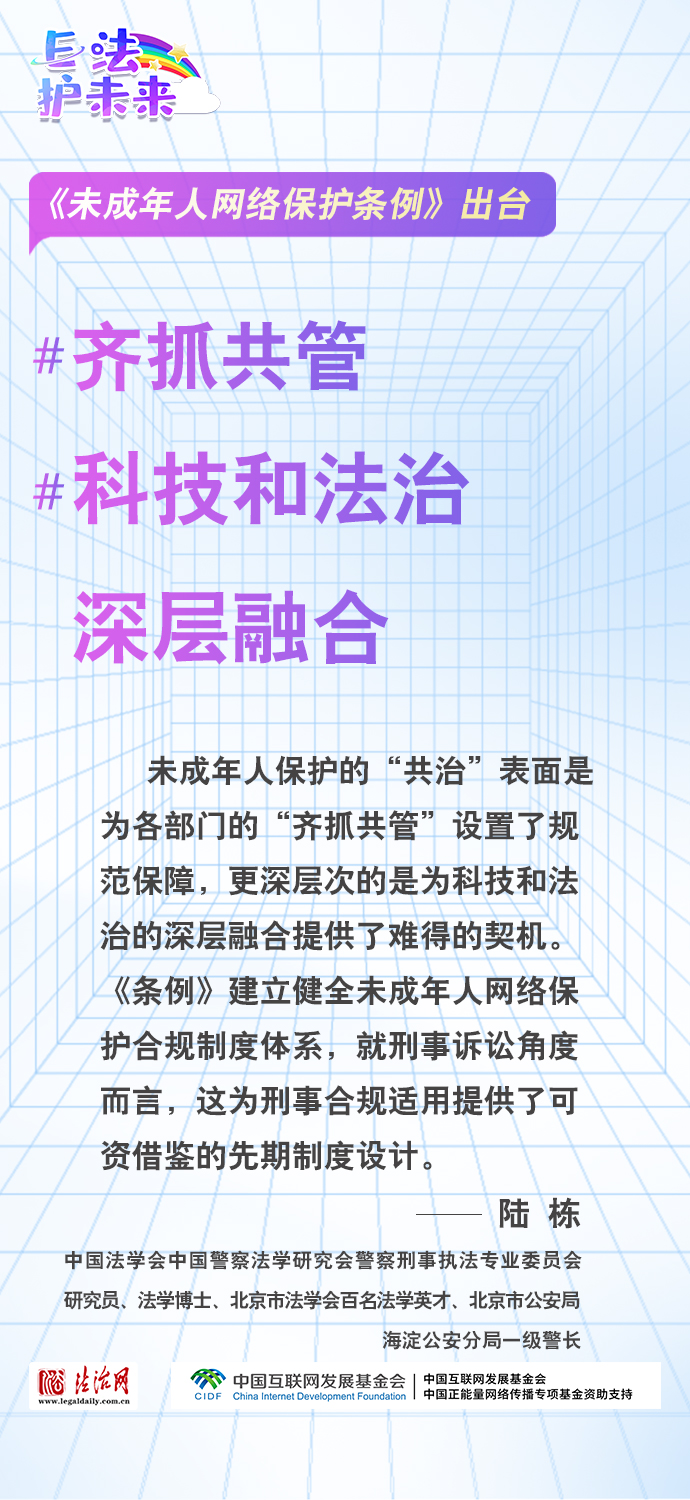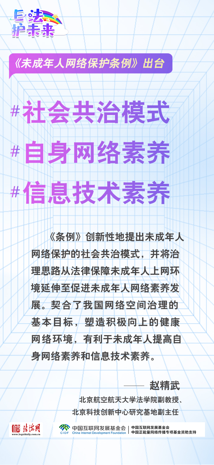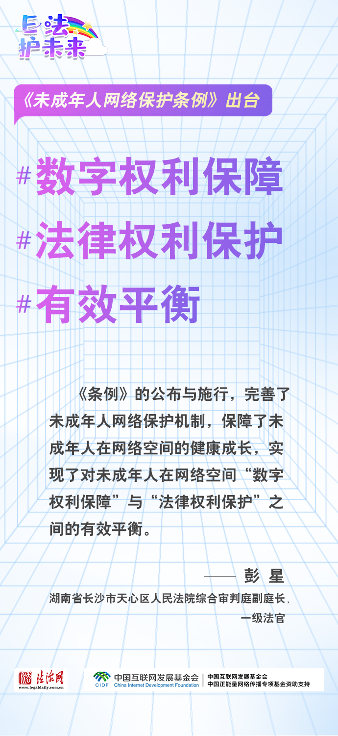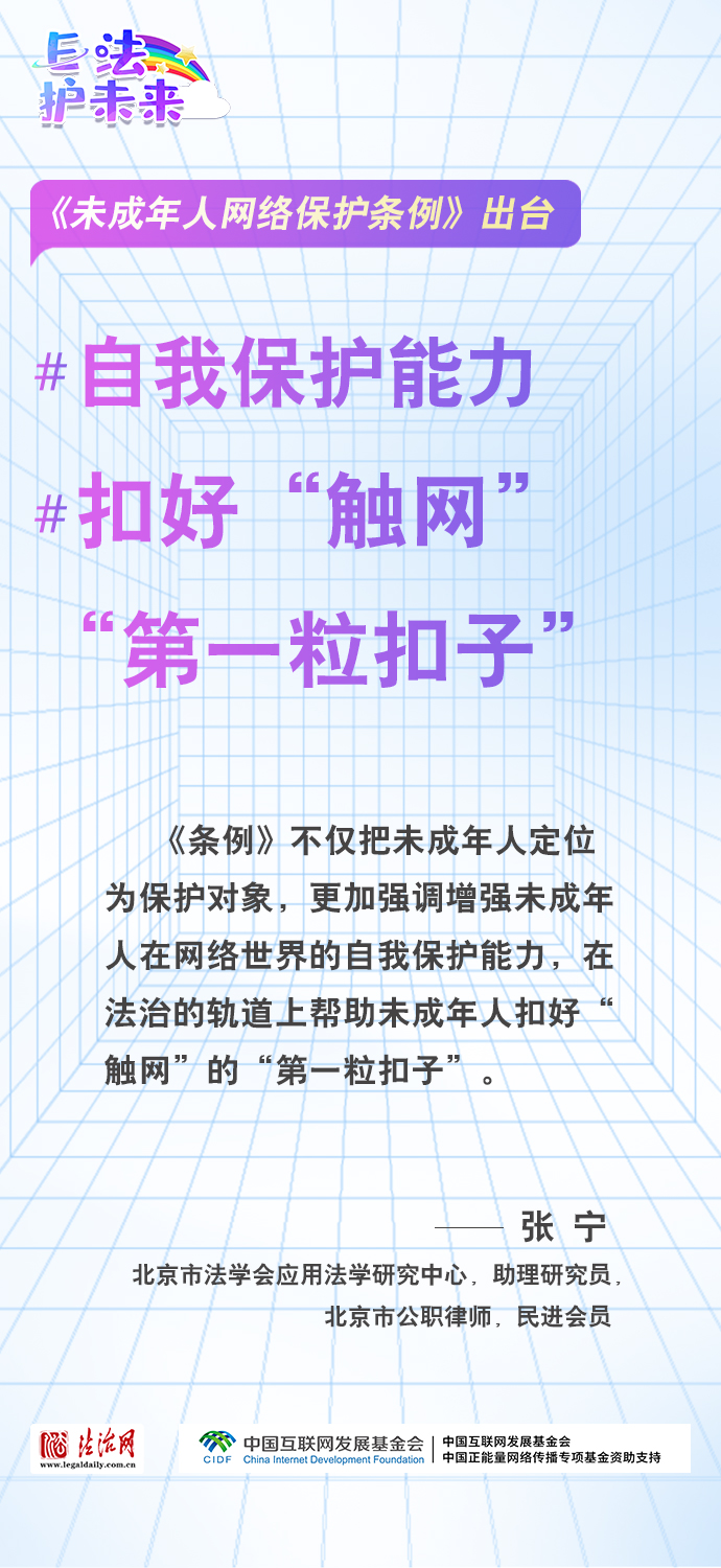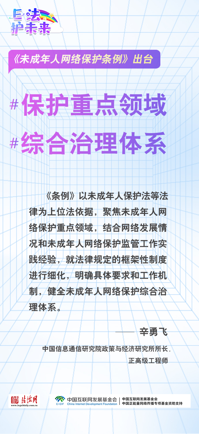 法治網(wǎng)特推出一組“專家有言”海報,內(nèi)容涵蓋《條例》出臺的現(xiàn)實意義和時代價值、網(wǎng)絡(luò)素養(yǎng)促進(jìn)、網(wǎng)絡(luò)信息內(nèi)容規(guī)范、個人信息網(wǎng)絡(luò)保護(hù)、網(wǎng)絡(luò)沉迷防治等,充分展現(xiàn)《條例》的出臺是我國互聯(lián)網(wǎng)治理領(lǐng)域的法治成果,彰顯中國在未成年人網(wǎng)絡(luò)保護(hù)領(lǐng)域的擔(dān)當(dāng),為全球未成年人網(wǎng)絡(luò)空間治理提供指引和樣本。