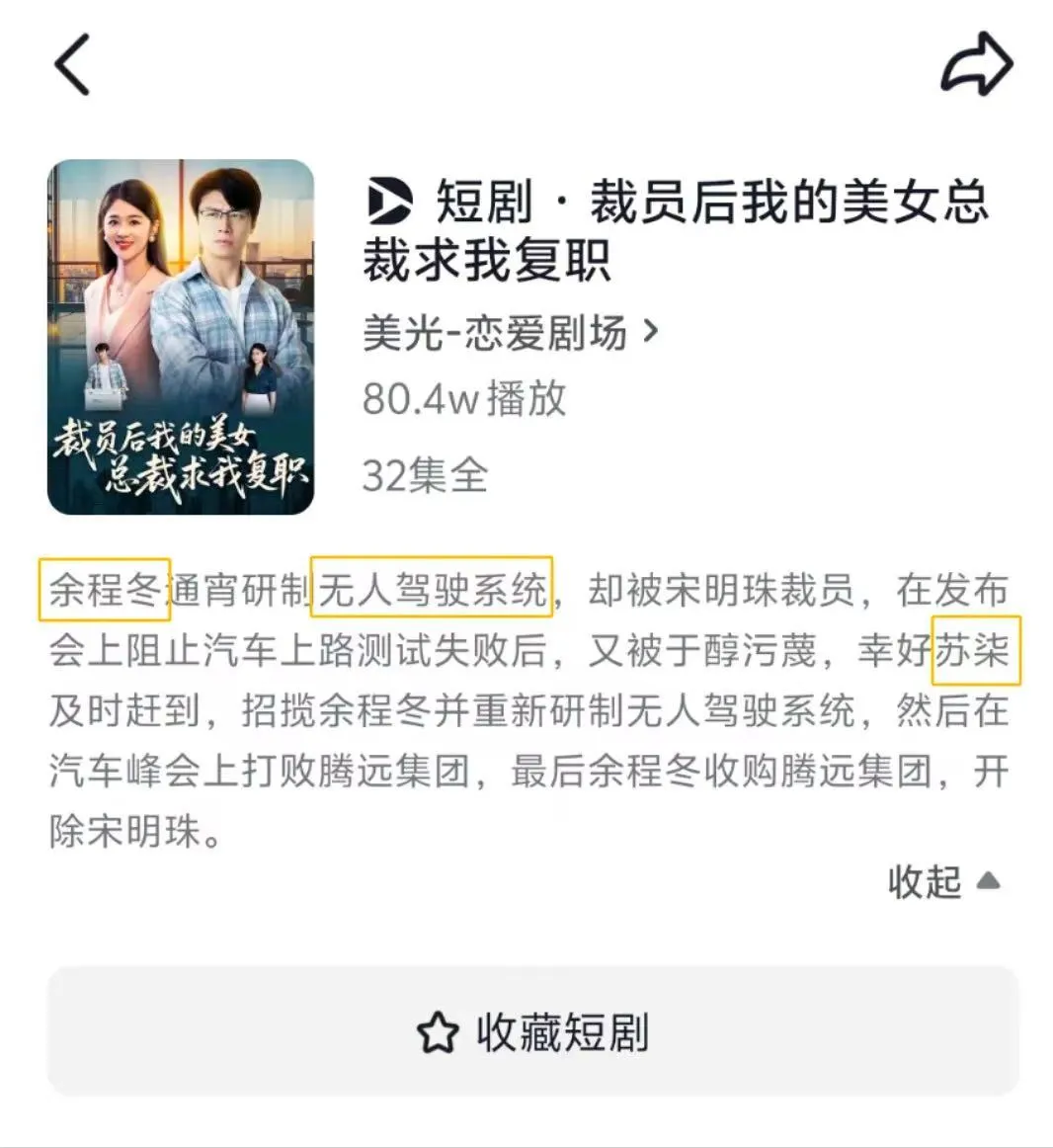 例如,余程冬名字與華為高管余承東高度相似、驍米集團(tuán)名稱似小米集團(tuán)、蘇柒角色名音同小米SU7車型。短劇中還涉及無人駕駛車輛一旦上路行駛30秒,系統(tǒng)就會失控崩潰的情節(jié),引發(fā)公眾聯(lián)想。目前,兩部短劇累積播放量分別為80.4萬次、1.7億次。