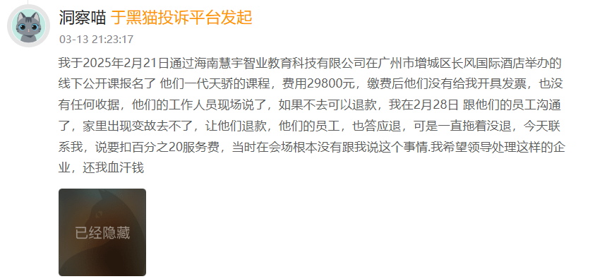 此外,在黑貓投訴上有多位消費(fèi)者投訴該類開設(shè)課程機(jī)構(gòu)存在涉嫌偷稅截留、霸王扣款等問題。比如,一位女士投訴稱,在廣州報名公開課,現(xiàn)場支付費(fèi)用29800元,繳費(fèi)后機(jī)構(gòu)未開發(fā)票,工作人員口頭承諾“不去即退全款”。然而當(dāng)其提出因計(jì)劃有變申請退款時,機(jī)構(gòu)拖延半月后突然提出“強(qiáng)扣20%服務(wù)費(fèi)”。