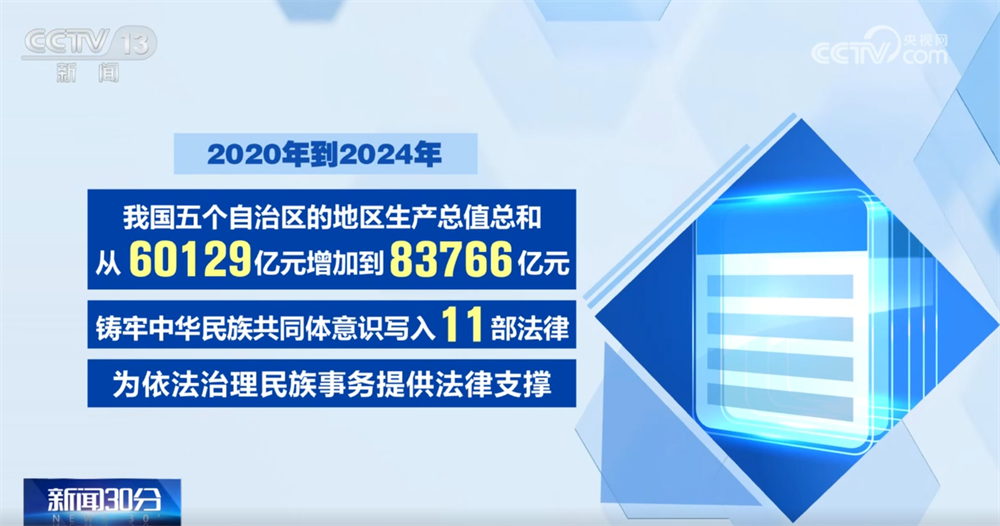 相關(guān)負責(zé)人表示,2020年到2024年,我國五個自治區(qū)的地區(qū)生產(chǎn)總值總和從60129億元增加到83766億元。鑄牢中華民族共同體意識寫入11部法律,為依法治理民族事務(wù)提供法律支撐。