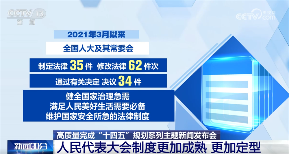 2021年3月以來,全國人大及其常委會制定法律35件、修改法律62件次,通過有關(guān)決定、決議34件,健全國家治理急需、滿足人民美好生活需要必備、維護國家安全所急的法律制度。