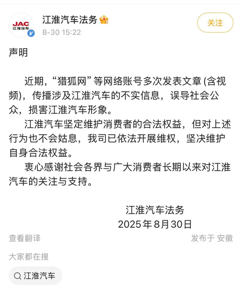 而在前一天的8月30日,@江淮汽車法務(wù)發(fā)布聲明:近期,“獵狐網(wǎng)”等網(wǎng)絡(luò)賬號(hào)多次發(fā)表文章(含視頻),傳播涉及江淮汽車的不實(shí)信息,誤導(dǎo)社會(huì)公眾,損害江淮汽車形象。江淮汽車堅(jiān)定維護(hù)消費(fèi)者的合法權(quán)益,但對上述行為也不會(huì)姑息,我司已依法開展維權(quán),堅(jiān)決維護(hù)自身合法權(quán)益。