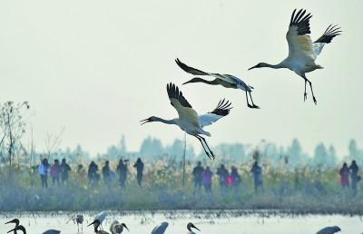 人們?cè)诮髹蛾?yáng)湖畔鯉魚(yú)洲觀察拍攝白鶴。新華社發(fā)