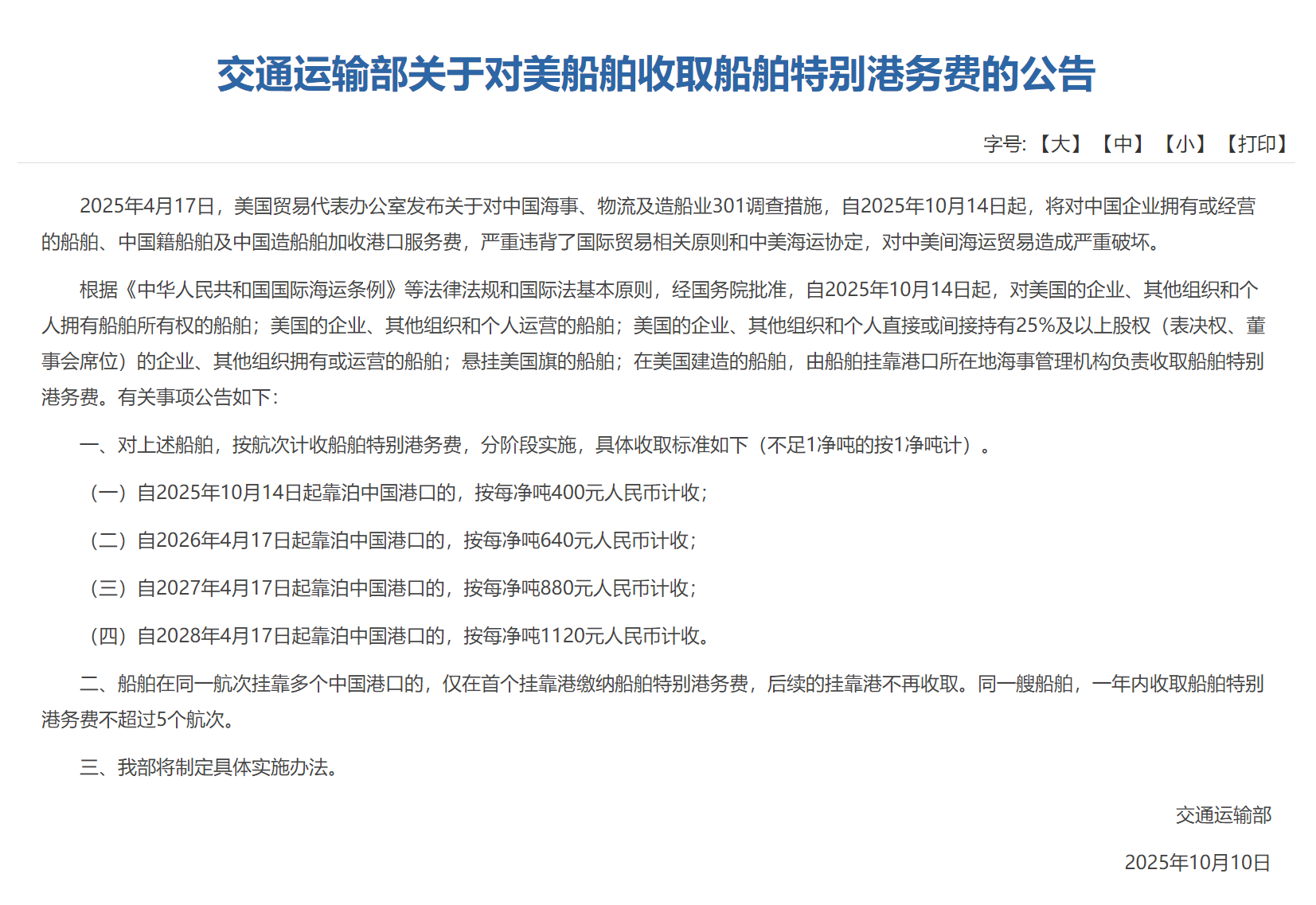 10月10日,交通運(yùn)輸部發(fā)布《交通運(yùn)輸部關(guān)于對(duì)美船舶收取船舶特別港務(wù)費(fèi)的公告》(以下簡稱《公告》),決定將于10月14日起對(duì)涉美船舶收取船舶特別港務(wù)費(fèi)。