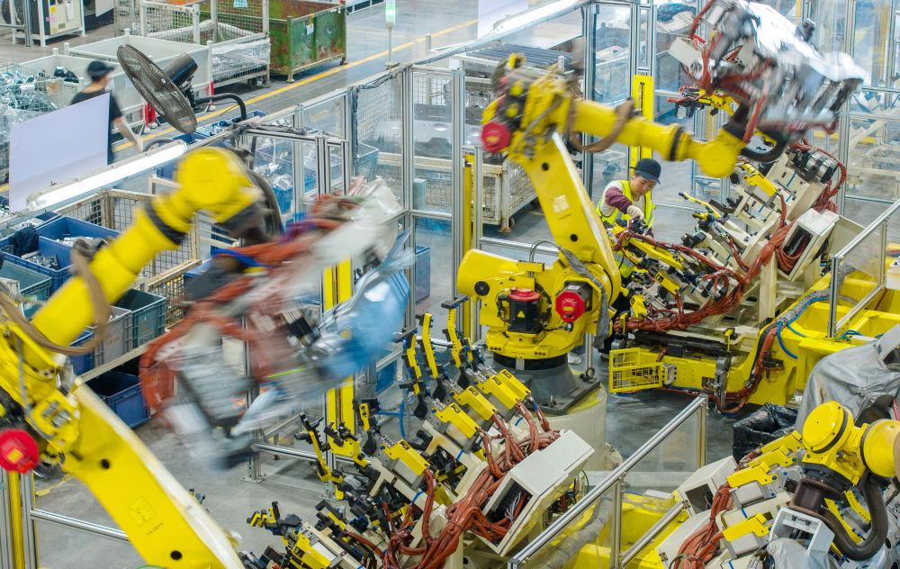 浙江省湖州市長(zhǎng)興經(jīng)濟(jì)技術(shù)開發(fā)區(qū)的長(zhǎng)興地通汽車部件有限公司技術(shù)人員操控工業(yè)機(jī)器人生產(chǎn)新能源汽車配件(無人機(jī)照片,2025年10月9日攝)。新華社發(fā)(譚云俸 攝)