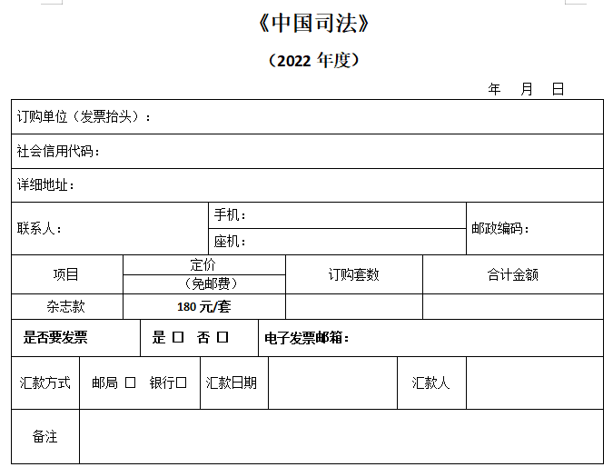 單位匯款時請務(wù)必標明“中國司法+訂購套數(shù)”,個人匯款請務(wù)必注明“單位名稱+中國司法”。