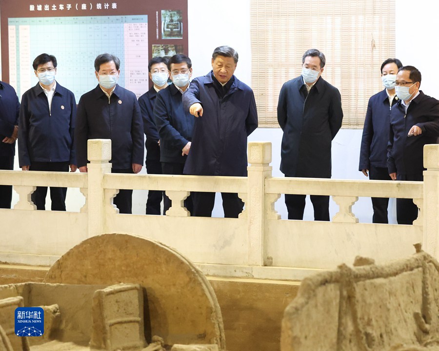 28日下午,習近平考察了位于安陽市西北郊洹河南北兩岸的殷墟遺址。殷墟是我國歷史上第一個文獻可考、為考古發(fā)掘所證實的商代晚期都城遺址。習近平步入殷墟博物館,仔細觀摩青銅器、玉器、甲骨文等出土文物。隨后,習近平來到車馬坑展廳,察看商代畜力車實物標本和道路遺跡。他指出,殷墟出土的甲骨文為我們保存3000年前的文字,把中國信史向上推進了約1000年。殷墟我向往已久,這次來是想更深地學習理解中華文明,古為今用,為更好建設中華民族現(xiàn)代文明提供借鑒。中國的漢文字非常了不起,中華民族的形成和發(fā)展離不開漢文字的維系。在這方面,考古事業(yè)居功至偉??脊殴ぷ饕^續(xù)重視和加強,繼續(xù)深化中華文明探源工程。中華文明源遠流長,從未中斷,塑造了我們偉大的民族,這個民族還會偉大下去的。要通過文物發(fā)掘、研究保護工作,更好地傳承優(yōu)秀傳統(tǒng)文化。習近平強調,中華優(yōu)秀傳統(tǒng)文化是我們黨創(chuàng)新理論的“根”,我們推進馬克思主義中國化時代化的根本途徑是“兩個結合”。我們要堅定文化自信,增強做中國人的自信心和自豪感。