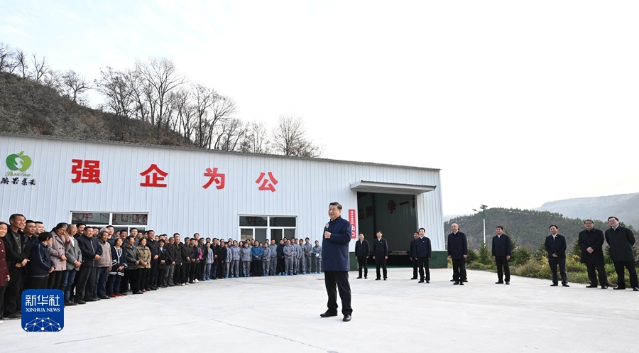 車間外,老鄉(xiāng)們聚集在一起,高聲向總書記問好。習近平同老鄉(xiāng)們拉起家常,回憶當年他在陜北的知青歲月。習近平對老鄉(xiāng)們說,我在陜北生活了7年,當年看到老鄉(xiāng)們生活很艱苦,心里就想著怎么樣讓大家生活好起來。這次來延安,看到一派碩果累累的豐收景象,交通條件大為改善,發(fā)生了翻天覆地的變化。過去陜北老鄉(xiāng)們修梯田、種莊稼,面朝黃土背朝天,掄起老鋤頭干活,廣種薄收,十分辛苦,如今山坡上退耕還林種上了蘋果,老鄉(xiāng)們有工作、有穩(wěn)定收入,孩子有好的教育,老人都有醫(yī)保,生活越來越好。從陜北的變化就可以看到中國的變化。習近平指出,現(xiàn)在,“兩個一百年”奮斗目標的第一個百年目標已經實現(xiàn),絕對貧困問題解決了,老鄉(xiāng)們過上了好日子,但還要繼續(xù)努力往前走,讓生活越來越美好。陜北的氣候、光照、緯度、海拔等非常適宜發(fā)展蘋果種植,加上滴灌技術、矮化種植技術、選果生產線等不斷發(fā)展,就地賣出,銷路不愁,大力發(fā)展蘋果種植業(yè)可謂天時地利人和,這是最好的、最合適的產業(yè),大有前途。習近平強調,中國共產黨是人民的黨,是為人民服務的黨,共產黨當家就是要為老百姓辦事,把老百姓的事情辦好??照務`國,實干興邦。要認真學習貫徹黨的二十大精神,全面推進鄉(xiāng)村振興,把富民政策一項一項落實好,加快推進農業(yè)農村現(xiàn)代化,讓老鄉(xiāng)們生活越來越紅火。老鄉(xiāng)們爆發(fā)出雷鳴般的掌聲。